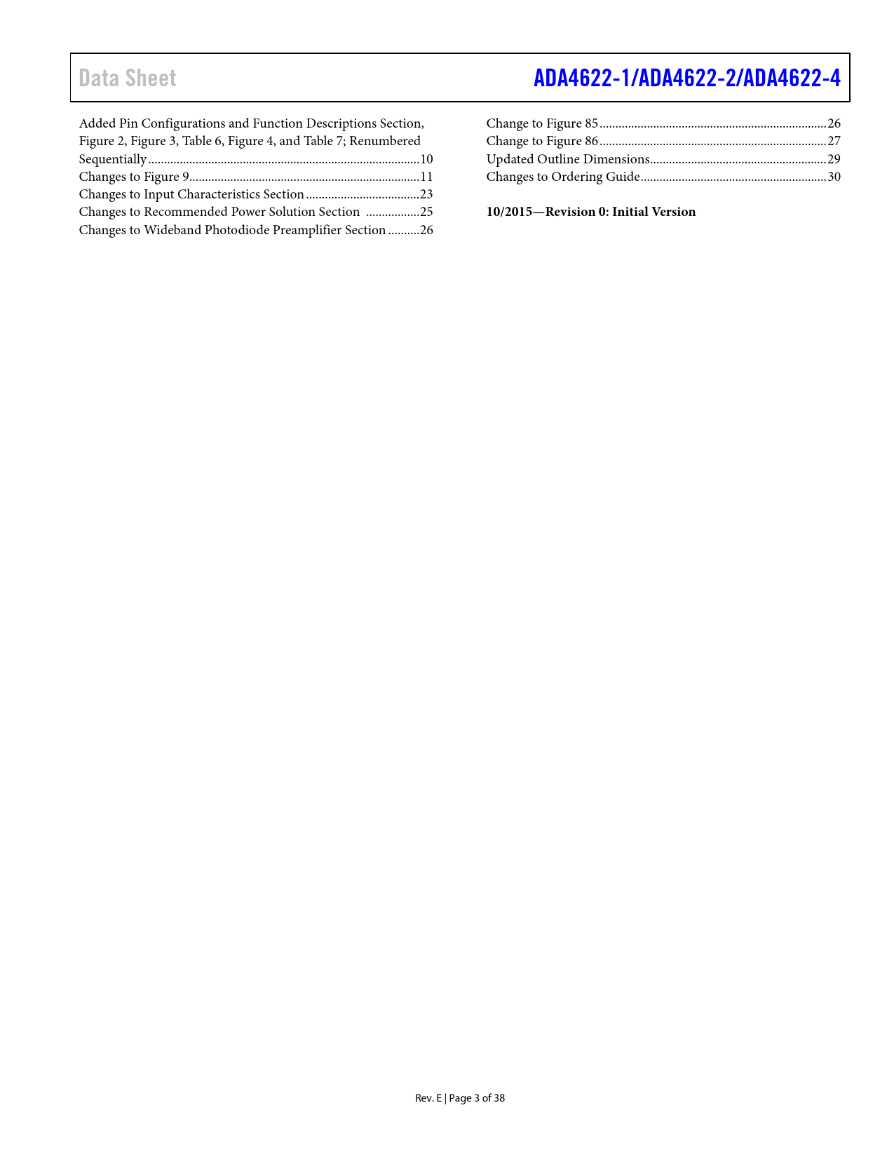 | Seiten / Seite | 38 / 3 — Data Sheet. ADA4622-1/ADA4622-2/ADA4622-4. 10/2015—Revision 0: Initial … |