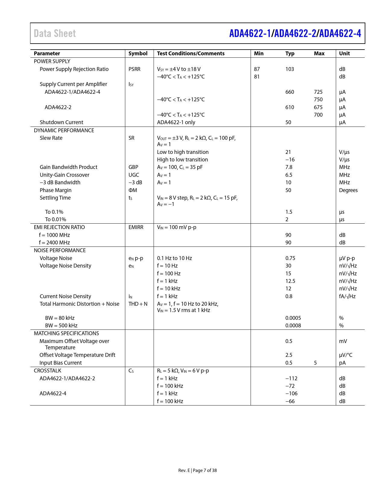 Data Sheet. ADA4622-1/. ADA4622-2/. ADA4622-4. Parameter. Symbol. Test Conditions/Comments. Min. Typ. Max. Unit