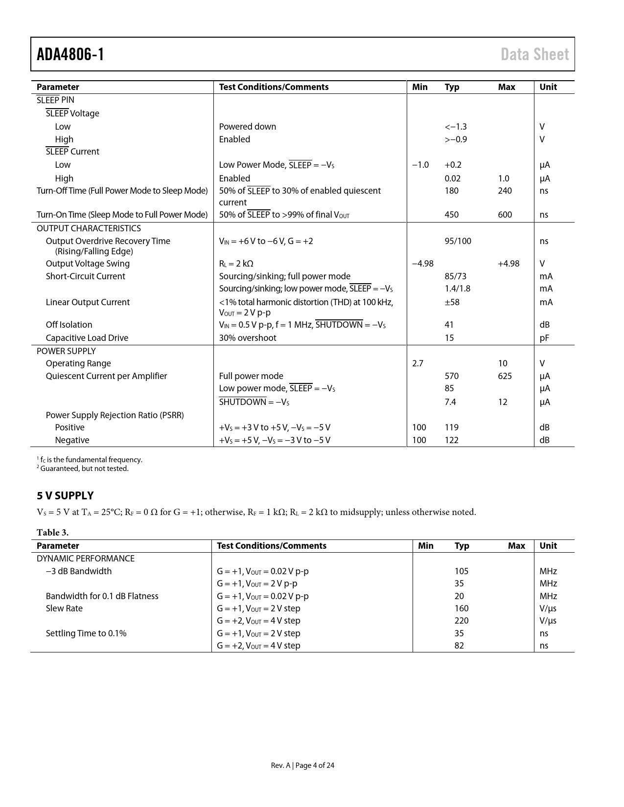 Seiten / Seite24 / 4 — ADA4806-1. Data Sheet. Parameter. Test Conditions/Comments. Min. Typ. …