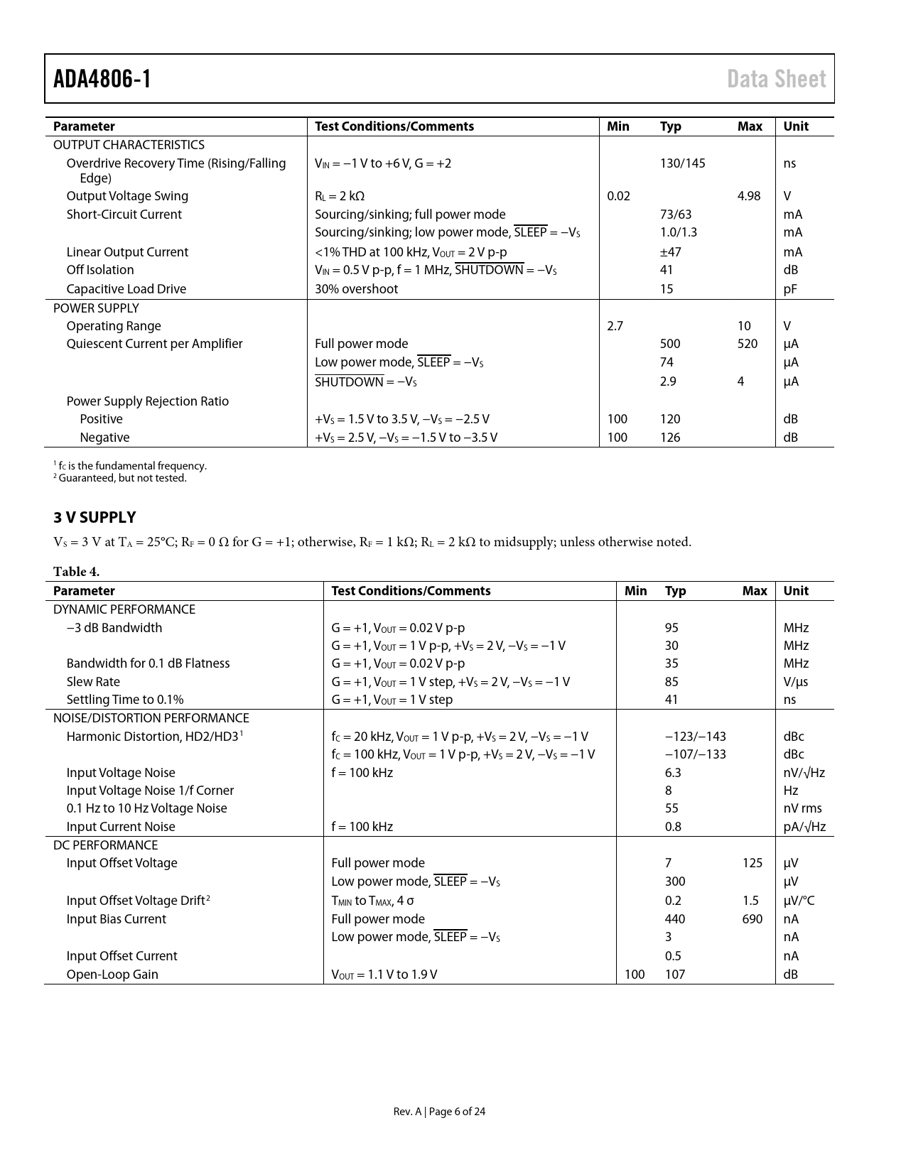 link to page 7 link to page 7 ADA4806-1Data SheetParameterTest Conditions/CommentsMinTypMaxUnit OUTPUT CHARACTERISTICS Overdrive Recovery Time (Rising/Falling VIN = −1 V to +6 V, G = +2 130/145 ns Edge) Output Voltage Swing RL = 2 kΩ 0.02 4.98 V Short-Circuit Current Sourcing/sinking; full power mode 73/63 mA Sourcing/sinking; low power mode, SLEEP = −VS 1.0/1.3 mA Linear Output Current <1% THD at 100 kHz, VOUT = 2 V p-p ±47 mA Off Isolation VIN = 0.5 V p-p, f = 1 MHz, SHUTDOWN = −VS 41 dB Capacitive Load Drive 30% overshoot 15 pF POWER SUPPLY Operating Range 2.7 10 V Quiescent Current per Amplifier Full power mode 500 520 µA Low power mode, SLEEP = −VS 74 µA SHUTDOWN = −VS 2.9 4 µA Power Supply Rejection Ratio Positive +VS = 1.5 V to 3.5 V, −VS = −2.5 V 100 120 dB Negative +VS = 2.5 V, −VS = −1.5 V to −3.5 V 100 126 dB 1 fC is the fundamental frequency. 2 Guaranteed, but not tested. 3 V SUPPLY VS = 3 V at TA = 25°C; RF = 0 Ω for G = +1; otherwise, RF = 1 kΩ; RL = 2 kΩ to midsupply; unless otherwise noted. Table 4. ParameterTest Conditions/CommentsMin TypMax Unit DYNAMIC PERFORMANCE −3 dB Bandwidth G = +1, VOUT = 0.02 V p-p 95 MHz G = +1, VOUT = 1 V p-p, +VS = 2 V, −VS = −1 V 30 MHz Bandwidth for 0.1 dB Flatness G = +1, VOUT = 0.02 V p-p 35 MHz Slew Rate G = +1, VOUT = 1 V step, +VS = 2 V, −VS = −1 V 85 V/µs Settling Time to 0.1% G = +1, VOUT = 1 V step 41 ns NOISE/DISTORTION PERFORMANCE Harmonic Distortion, HD2/HD31 fC = 20 kHz, VOUT = 1 V p-p, +VS = 2 V, −VS = −1 V −123/−143 dBc fC = 100 kHz, VOUT = 1 V p-p, +VS = 2 V, −VS = −1 V −107/−133 dBc Input Voltage Noise f = 100 kHz 6.3 nV/√Hz Input Voltage Noise 1/f Corner 8 Hz 0.1 Hz to 10 Hz Voltage Noise 55 nV rms Input Current Noise f = 100 kHz 0.8 pA/√Hz DC PERFORMANCE Input Offset Voltage Full power mode 7 125 µV Low power mode, SLEEP = −VS 300 µV Input Offset Voltage Drift2 TMIN to TMAX, 4 σ 0.2 1.5 µV/°C Input Bias Current Full power mode 440 690 nA Low power mode, SLEEP = −VS 3 nA Input Offset Current 0.5 nA Open-Loop Gain VOUT = 1.1 V to 1.9 V 100 107 dB Rev. A | Page 6 of 24 Document Outline FEATURES APPLICATIONS GENERAL DESCRIPTION TYPICAL APPLICATIONS CIRCUIT TABLE OF CONTENTS REVISION HISTORY SPECIFICATIONS ±5 V SUPPLY 5 V SUPPLY 3 V SUPPLY ABSOLUTE MAXIMUM RATINGS THERMAL RESISTANCE MAXIMUM POWER DISSIPATION ESD CAUTION PIN CONFIGURATION AND FUNCTION DESCRIPTIONS TYPICAL PERFORMANCE CHARACTERISTICS TEST CIRCUITS THEORY OF OPERATION AMPLIFIER DESCRIPTION INPUT PROTECTION SHUTDOWN/SLEEP MODE OPERATION NOISE CONSIDERATIONS APPLICATIONS INFORMATION SLEW ENHANCEMENT EFFECT OF FEEDBACK RESISTOR ON FREQUENCY RESPONSE COMPENSATING PEAKING IN LARGE SIGNAL FREQUENCY RESPONSE DRIVING LOW POWER, HIGH RESOLUTION SUCCESSIVE APPROXIMATION REGISTER (SAR) ADCs DYNAMIC POWER SCALING SINGLE-ENDED TO DIFFERENTIAL CONVERSION LAYOUT CONSIDERATIONS Ground Plane Power Supply Bypassing OUTLINE DIMENSIONS ORDERING GUIDE