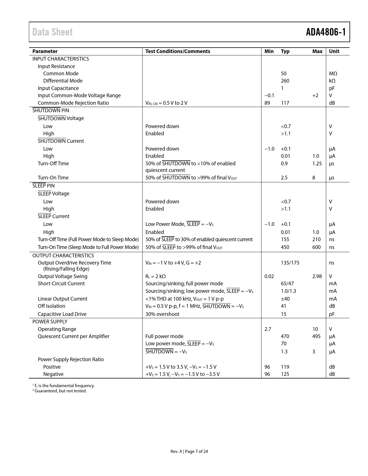 Seiten / Seite24 / 7 — Data Sheet. ADA4806-1. Parameter. Test Conditions/Comments. Min Typ. Max …