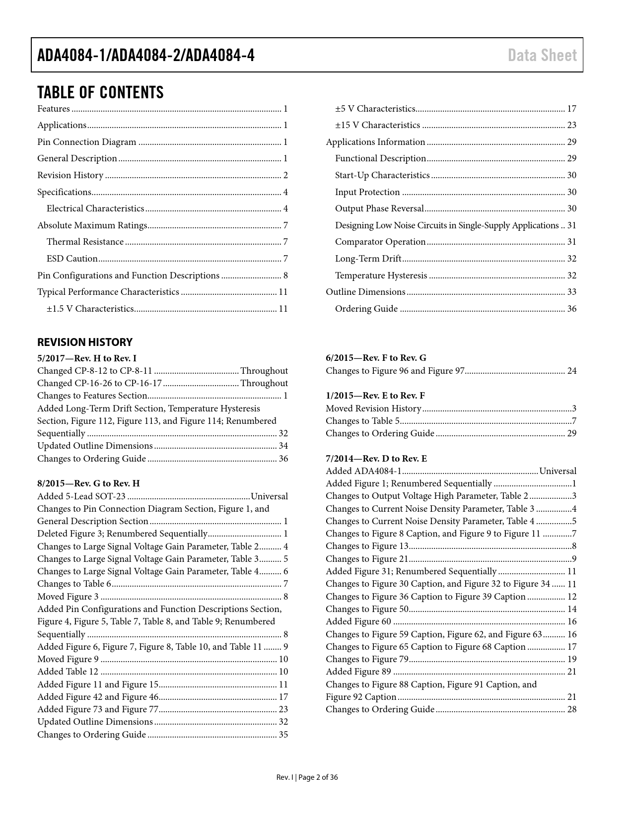 ADA4084-1/ADA4084-2/ADA4084-4 Data Sheet TABLE OF CONTENTS REVISION HISTORY 5/2017—Rev H to Rev I 6/2015—Rev F to Rev G