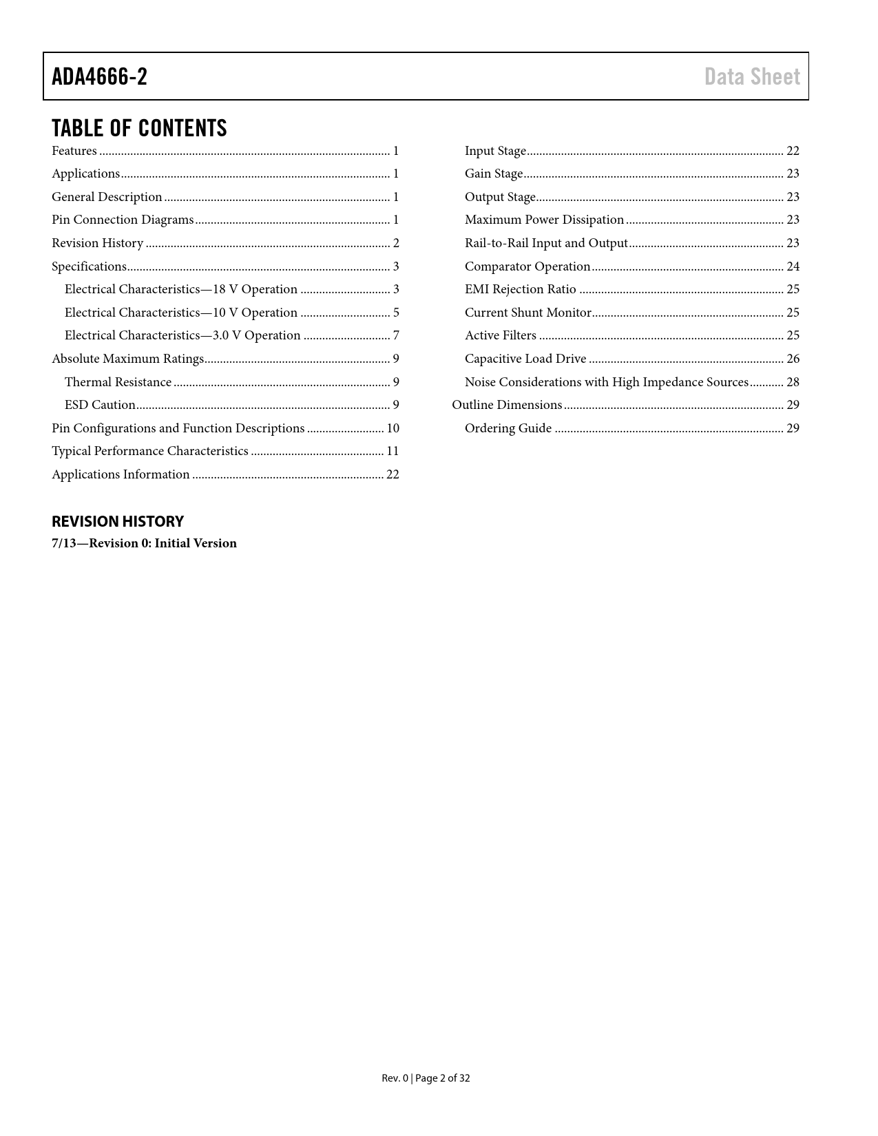 Seiten / Seite32 / 2 — ADA4666-2. Data Sheet. TABLE OF CONTENTS. REVISION HISTORY. 7/13—Revision …