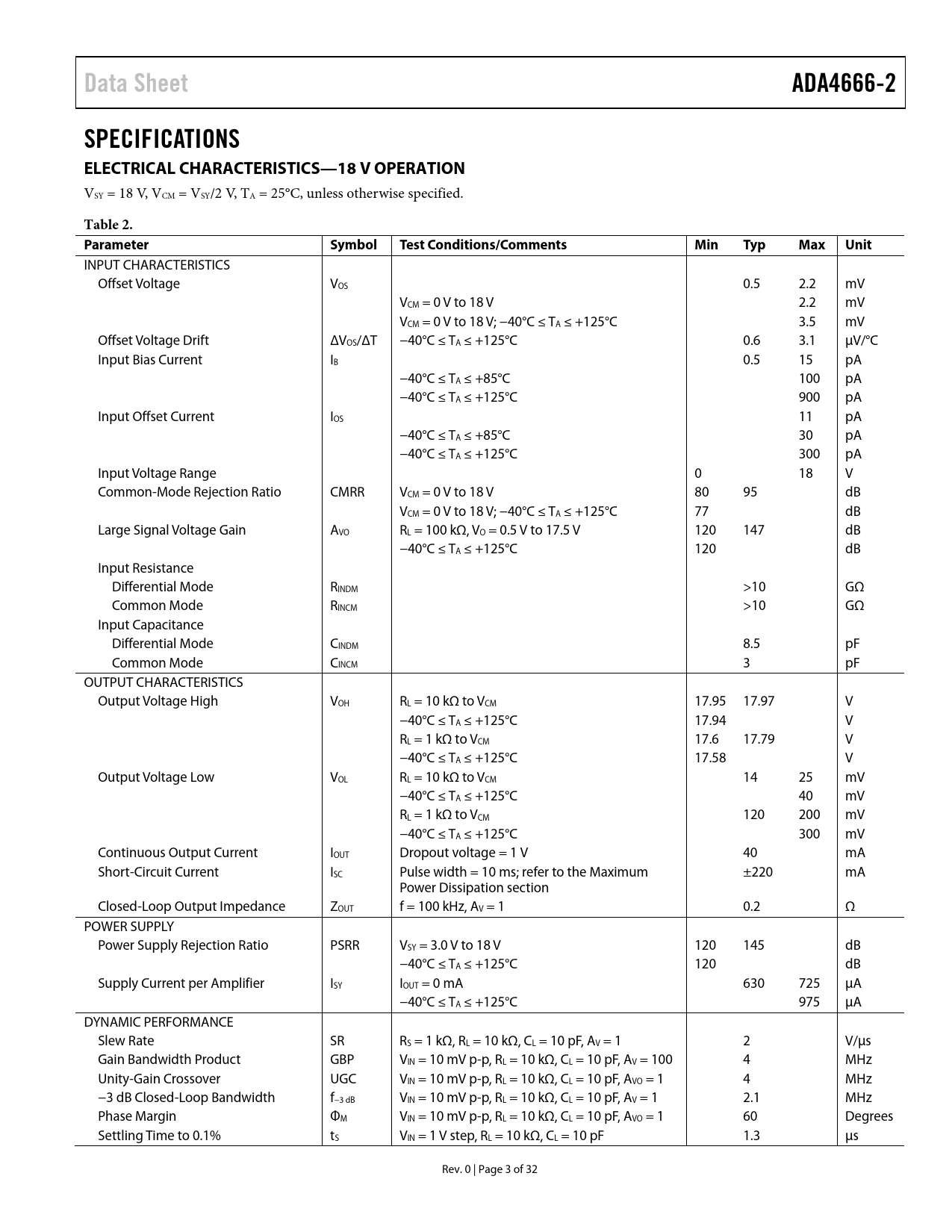 Data Sheet. ADA4666-2. SPECIFICATIONS ELECTRICAL CHARACTERISTICS—18 V OPERATION. Table 2. Parameter. Symbol