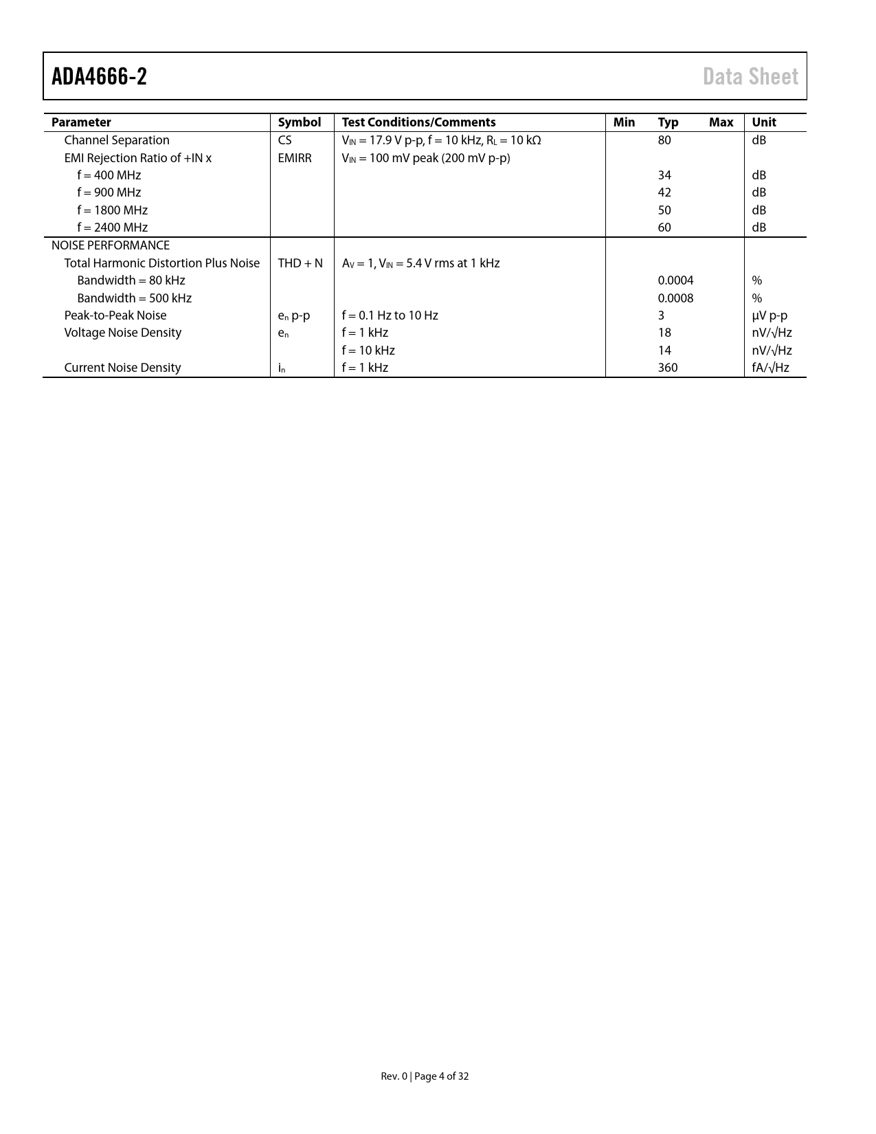 ADA4666-2Data SheetParameterSymbolTest Conditions/CommentsMinTypMaxUnit Channel Separation CS VIN = 17.9 V p-p, f = 10 kHz, RL = 10 kΩ 80 dB EMI Rejection Ratio of +IN x EMIRR VIN = 100 mV peak (200 mV p-p) f = 400 MHz 34 dB f = 900 MHz 42 dB f = 1800 MHz 50 dB f = 2400 MHz 60 dB NOISE PERFORMANCE Total Harmonic Distortion Plus Noise THD + N AV = 1, VIN = 5.4 V rms at 1 kHz Bandwidth = 80 kHz 0.0004 % Bandwidth = 500 kHz 0.0008 % Peak-to-Peak Noise en p-p f = 0.1 Hz to 10 Hz 3 µV p-p Voltage Noise Density en f = 1 kHz 18 nV/√Hz f = 10 kHz 14 nV/√Hz Current Noise Density in f = 1 kHz 360 fA/√Hz Rev. 0 | Page 4 of 32 Document Outline Features Applications General Description Pin Connection Diagrams Revision History Specifications Electrical Characteristics—18 V Operation Electrical Characteristics—10 V Operation Electrical Characteristics—3.0 V Operation Absolute Maximum Ratings Thermal Resistance ESD Caution Pin Configurations and Function Descriptions Typical Performance Characteristics Applications Information Input Stage Gain Stage Output Stage Maximum Power Dissipation Rail-to-Rail Input and Output Comparator Operation EMI Rejection Ratio Current Shunt Monitor Active Filters Capacitive Load Drive Noise Considerations with High Impedance Sources Outline Dimensions Ordering Guide