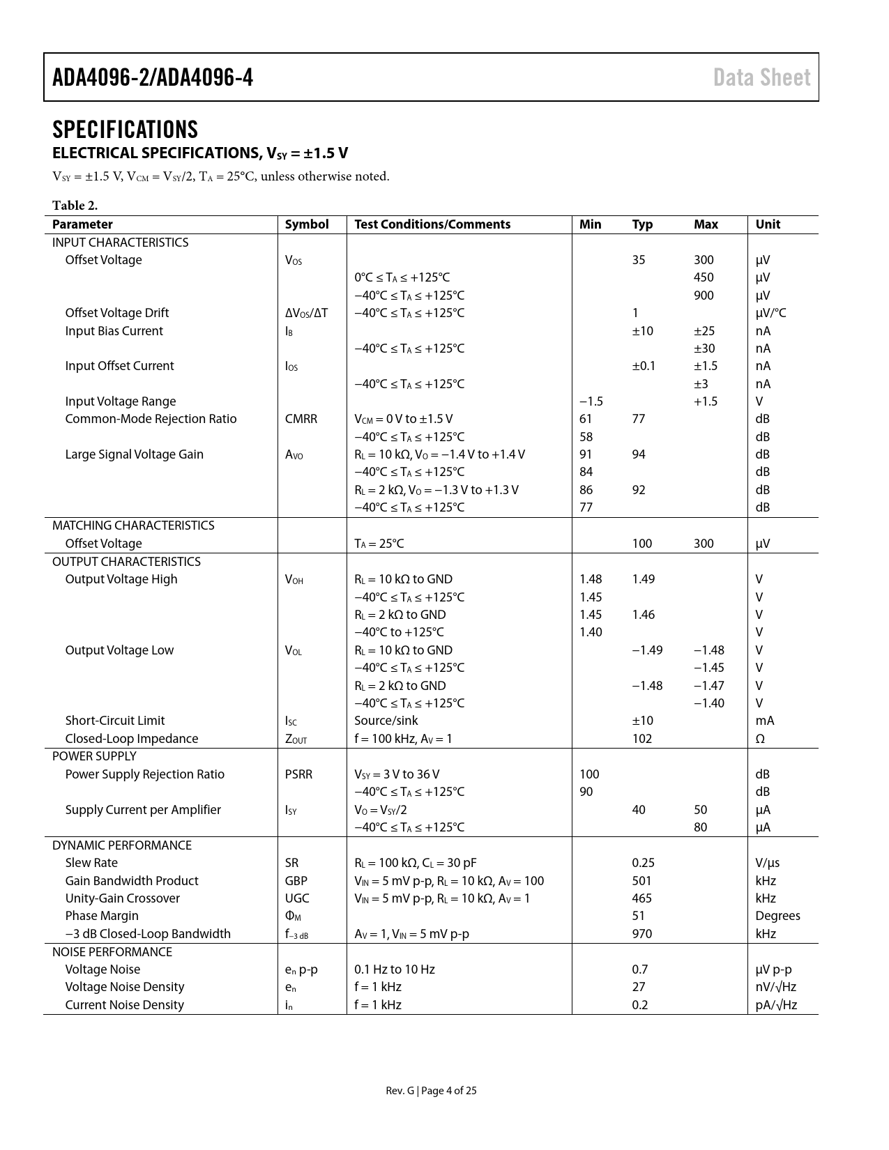 ADA4096-2/ADA4096-4. Data Sheet. SPECIFICATIONS ELECTRICAL SPECIFICATIONS, VSY = ±1.5 V. Table 2. Parameter. Symbol
