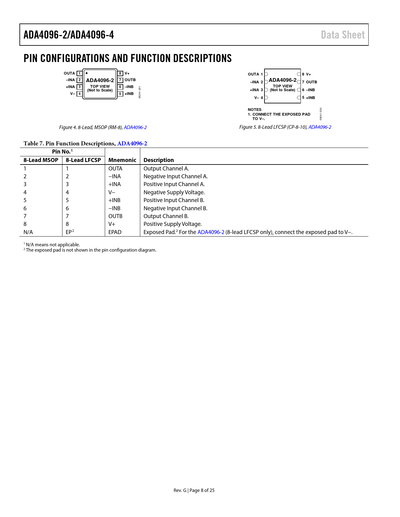 Table 7. Pin Function Descriptions, ADA4096-2 Pin No.1 8-Lead MSOP 8-Lead LFCSP Mnemonic Description