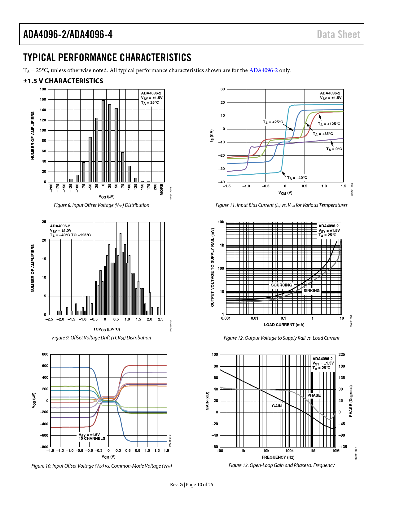 ADA4096-2/ADA4096-4Data SheetTYPICAL PERFORMANCE CHARACTERISTICS TA = 25°C, unless otherwise noted. Al typical performance characteristics shown are for the ADA4096-2 only. ±1.5 V CHARACTERISTICS18030ADA4096-2ADA4096-2160VSY = ±1.5VVSY = ±1.5VTA = 25°C20140RS10IE120IFTA = +25°CLTA = +125°CP1000A)AMnTA = +85°CF(80I B–10R O BET60A = 0°C–20NUM40–3020TA = –40°C0–400255075–1.5–1.0–0.500.51.01.5 005 –75–50–25100125150175200RE–200–175–150–125–100O 003 MVCM (V)V 09241- OS (µV) 09241- Figure 8. Input Offset Voltage (VOS) Distribution Figure 11. Input Bias Current (IB) vs. VCM for Various Temperatures 2510kADA4096-2ADA4096-2)VSY = ±1.5VVVSY = ±1.5VTmA = –40°C TO +125°CTA = 25°C20IL ( A1kRSRIELYIFPLP15PUAM F100TO SR OGE10BESOURCINGOLTANUMT V10SINKING5U TPOU01–2.5–2.0–1.5–1.0–0.500.51.01.52.02.50.0010.010.1110 006 004 LOAD CURRENT (mA) 09241- TCVOS (µV/°C) 09241- Figure 9. Offset Voltage Drift (TCVOS) Distribution Figure 12. Output Voltage to Supply Rail vs. Load Current 800100225ADA4096-2 V60080SY = ±1.5VT180A = 25°C400601352004090rees)V)B)PHASEµd(02045DegN ((OSEVAIGAING–20000HAS P–400–20–45–600VSY = ±1.5V–40–90 210 10 CHANNELS–800 09241- –60–135–1.5 –1.3 –1.0 –0.8 –0.5 –0.300.30.50.81.01.31.51001k10k100k1M10M 007 VCM (V)FREQUENCY (Hz) 09241- Figure 10. Input Offset Voltage (VOS) vs. Common-Mode Voltage (VCM) Figure 13. Open-Loop Gain and Phase vs. Frequency Rev. G | Page 10 of 25 Document Outline Features Applications Pin Connection Diagrams General Description Revision History Specifications Electrical Specifications, VSY = ±1.5 V Electrical Specifications, VSY = ±5 V Electrical Specifications, VSY = ±15 V Absolute Maximum Ratings Thermal Resistance ESD Caution Pin Configurations and Function Descriptions Typical Performance Characteristics ±1.5 V Characteristics ±5 V Characteristics ±15 V Characteristics Comparative Voltage and Variable Voltage Graphs Theory of Operation Input Stage Phase Inversion Input Overvoltage Protection Comparator Operation Outline Dimensions Ordering Guide Automotive Products