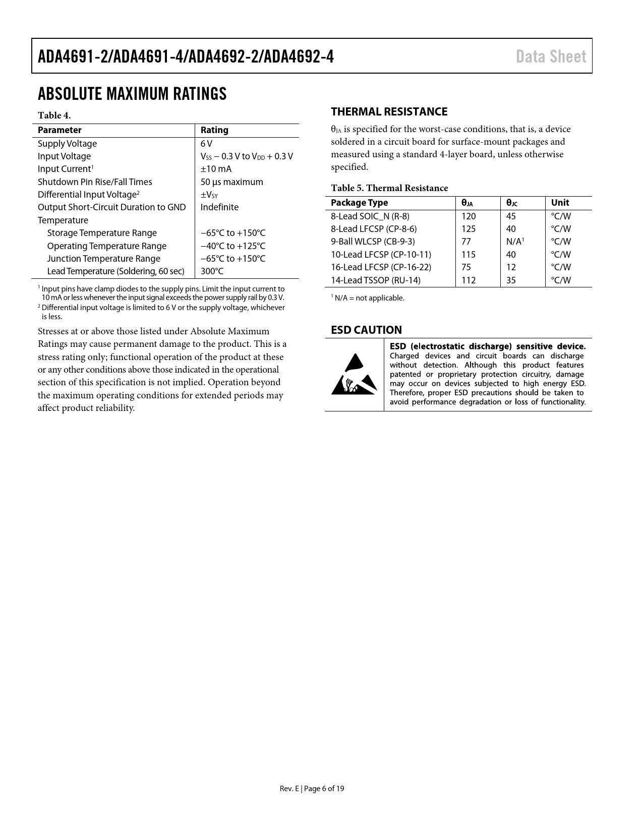 ADA4691-2/ADA4691-4/ADA4692-2/ADA4692-4Data SheetABSOLUTE MAXIMUM RATINGS Table 4.THERMAL RESISTANCEParameterRating θJA is specified for the worst-case conditions, that is, a device Supply Voltage 6 V soldered in a circuit board for surface-mount packages and Input Voltage V measured using a standard 4-layer board, unless otherwise SS − 0.3 V to VDD + 0.3 V Input Current1 ±10 mA specified. Shutdown Pin Rise/Fall Times 50 µs maximum Table 5. Thermal Resistance Differential Input Voltage2 ±VSY Output Short-Circuit Duration to GND Indefinite Package TypeθJAθJCUnit Temperature 8-Lead SOIC_N (R-8) 120 45 °C/W Storage Temperature Range −65°C to +150°C 8-Lead LFCSP (CP-8-6) 125 40 °C/W Operating Temperature Range −40°C to +125°C 9-Ball WLCSP (CB-9-3) 77 N/A1 °C/W Junction Temperature Range −65°C to +150°C 10-Lead LFCSP (CP-10-11) 115 40 °C/W Lead Temperature (Soldering, 60 sec) 300°C 16-Lead LFCSP (CP-16-22) 75 12 °C/W 14-Lead TSSOP (RU-14) 112 35 °C/W 1 Input pins have clamp diodes to the supply pins. Limit the input current to 10 mA or less whenever the input signal exceeds the power supply rail by 0.3 V. 1 N/A = not applicable. 2 Differential input voltage is limited to 6 V or the supply voltage, whichever is less. Stresses at or above those listed under Absolute Maximum ESD CAUTION Ratings may cause permanent damage to the product. This is a stress rating only; functional operation of the product at these or any other conditions above those indicated in the operational section of this specification is not implied. Operation beyond the maximum operating conditions for extended periods may affect product reliability. Rev. E | Page 6 of 19 Document Outline Features Applications General Description Revision History Specifications Electrical Characteristics—2.7 V Operation Electrical Characteristics—5 V Operation Absolute Maximum Ratings Thermal Resistance ESD Caution Pin Configurations Typical Performance Characteristics Shutdown Operation Input Pin Characteristics Input Threshold Outline Dimensions Ordering Guide