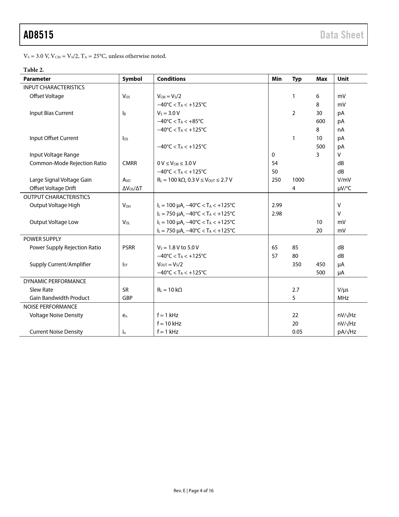 AD8515Data Sheet VS = 3.0 V, VCM = VS/2, TA = 25°C, unless otherwise noted. Table 2. ParameterSymbolConditionsMinTypMaxUnit INPUT CHARACTERISTICS Offset Voltage VOS VCM = VS/2 1 6 mV −40°C < TA < +125°C 8 mV Input Bias Current IB VS = 3.0 V 2 30 pA −40°C < TA < +85°C 600 pA −40°C < TA < +125°C 8 nA Input Offset Current IOS 1 10 pA −40°C < TA < +125°C 500 pA Input Voltage Range 0 3 V Common-Mode Rejection Ratio CMRR 0 V ≤ VCM ≤ 3.0 V 54 dB −40°C < TA < +125°C 50 dB Large Signal Voltage Gain AVO RL = 100 kΩ, 0.3 V ≤ VOUT ≤ 2.7 V 250 1000 V/mV Offset Voltage Drift ΔVOS/ΔT 4 μV/°C OUTPUT CHARACTERISTICS Output Voltage High VOH IL = 100 μA, −40°C < TA < +125°C 2.99 V IL = 750 μA, −40°C < TA < +125°C 2.98 V Output Voltage Low VOL IL = 100 μA, −40°C < TA < +125°C 10 mV IL = 750 μA, −40°C < TA < +125°C 20 mV POWER SUPPLY Power Supply Rejection Ratio PSRR VS = 1.8 V to 5.0 V 65 85 dB −40°C < TA < +125°C 57 80 dB Supply Current/Amplifier ISY VOUT = VS/2 350 450 μA −40°C < TA < +125°C 500 μA DYNAMIC PERFORMANCE Slew Rate SR RL = 10 kΩ 2.7 V/µs Gain Bandwidth Product GBP 5 MHz NOISE PERFORMANCE Voltage Noise Density en f = 1 kHz 22 nV/√Hz f = 10 kHz 20 nV/√Hz Current Noise Density in f = 1 kHz 0.05 pA/√Hz Rev. E | Page 4 of 16 Document Outline FEATURES APPLICATIONS PIN CONFIGURATION GENERAL DESCRIPTION TABLE OF CONTENTS REVISION HISTORY SPECIFICATIONS ELECTRICAL CHARACTERISTICS ABSOLUTE MAXIMUM RATINGS THERMAL RESISTANCE ESD CAUTION TYPICAL PERFORMANCE CHARACTERISTICS THEORY OF OPERATION POWER CONSUMPTION vs. BANDWIDTH DRIVING CAPACITIVE LOADS FULL POWER BANDWIDTH A MICROPOWER REFERENCE VOLTAGE GENERATOR A 100 kHz SINGLE-SUPPLY SECOND-ORDER BAND-PASS FILTER WIEN BRIDGE OSCILLATOR OUTLINE DIMENSIONS ORDERING GUIDE