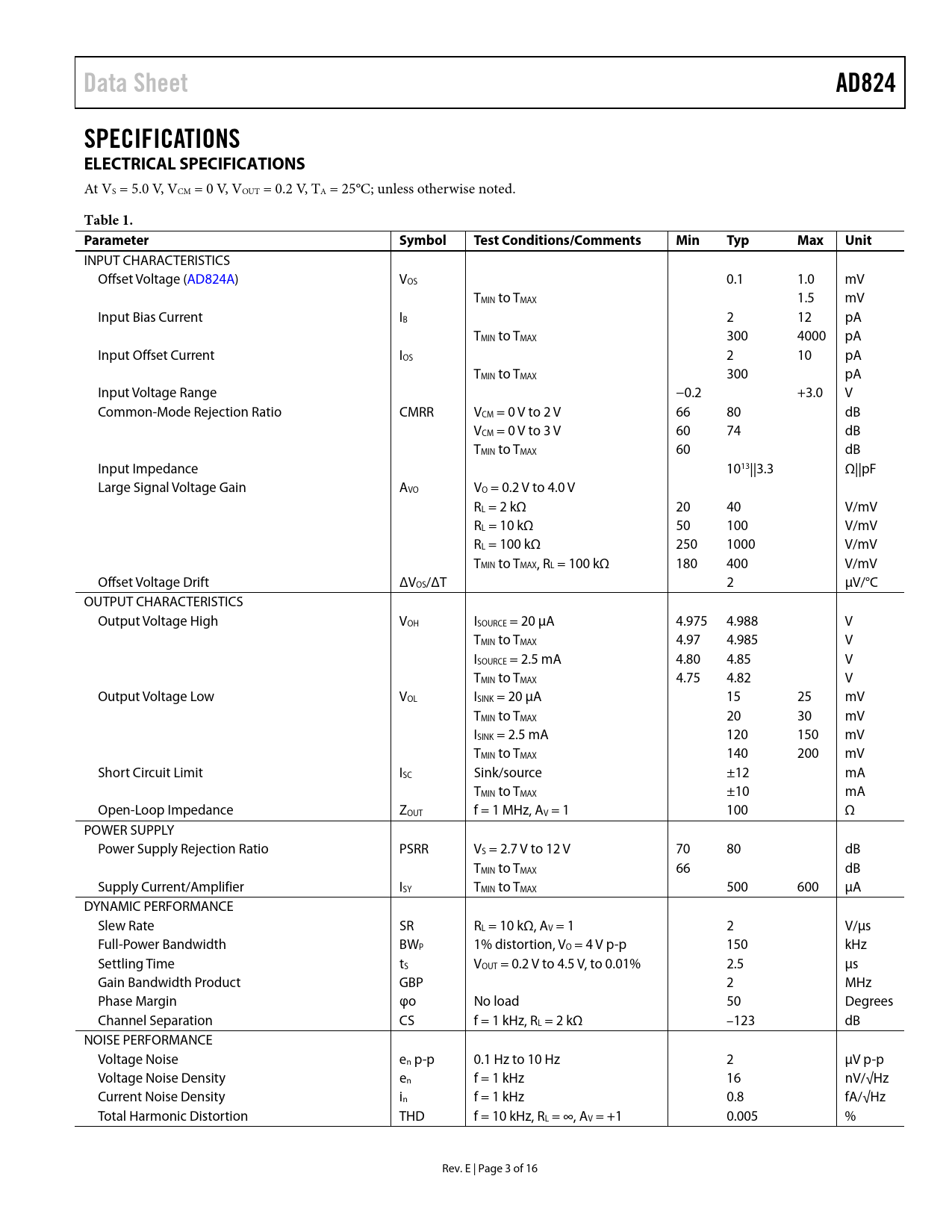 Data Sheet AD824 SPECIFICATIONS ELECTRICAL SPECIFICATIONS