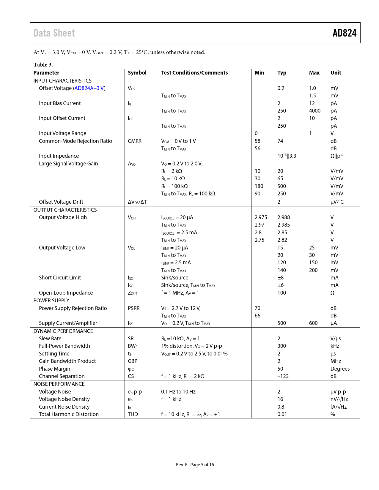 Data Sheet. AD824. Table 3. Parameter. Symbol. Test Conditions/Comments. Min. Typ. Max. Unit