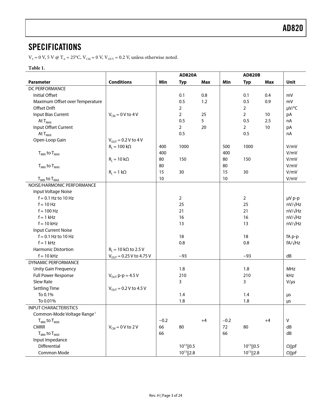 AD820. SPECIFICATIONS. Table 1. AD820A. AD820B. Parameter. Conditions. Min. Typ. Max. Unit