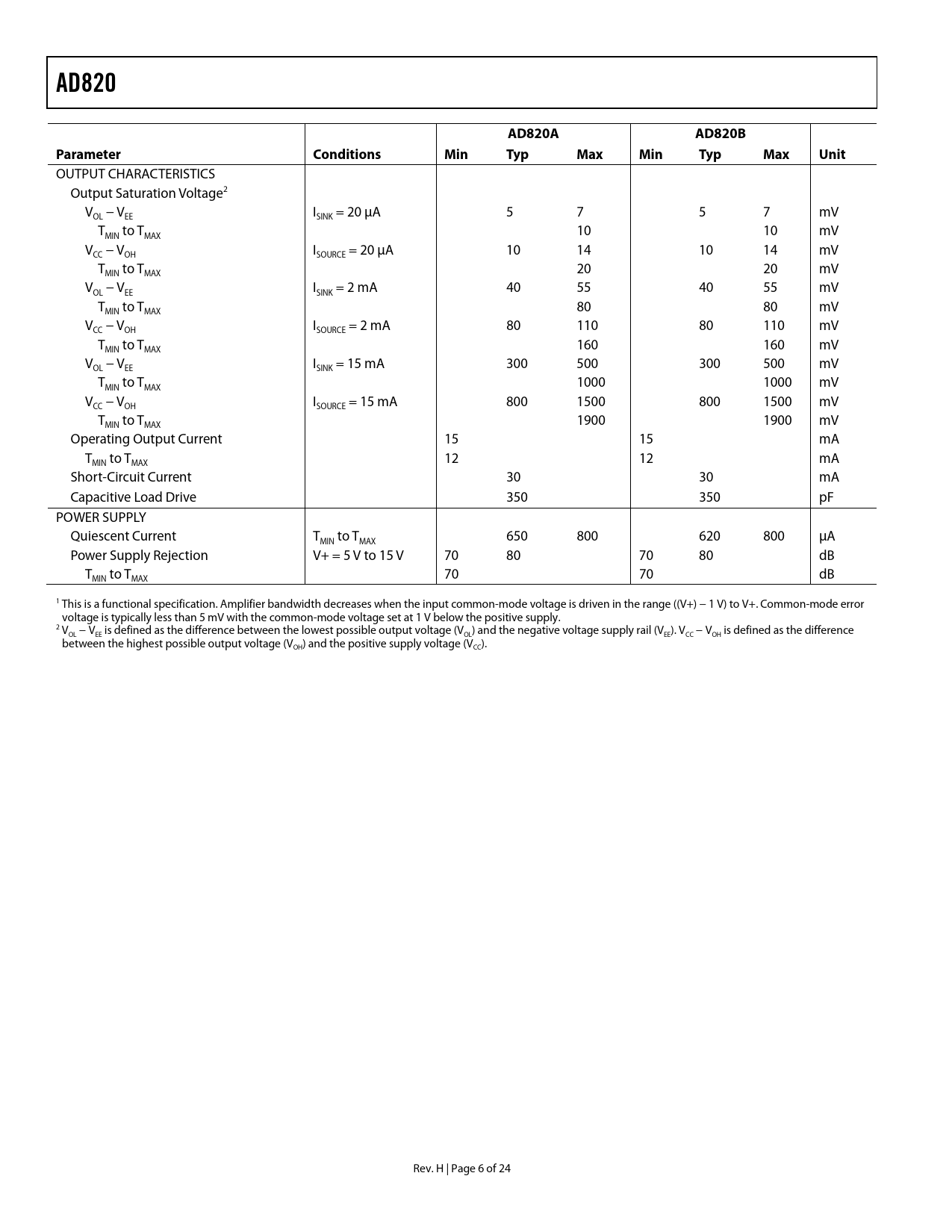 Seiten / Seite24 / 6 — AD820. AD820A. AD820B. Parameter. Conditions. Min. Typ. Max. Unit