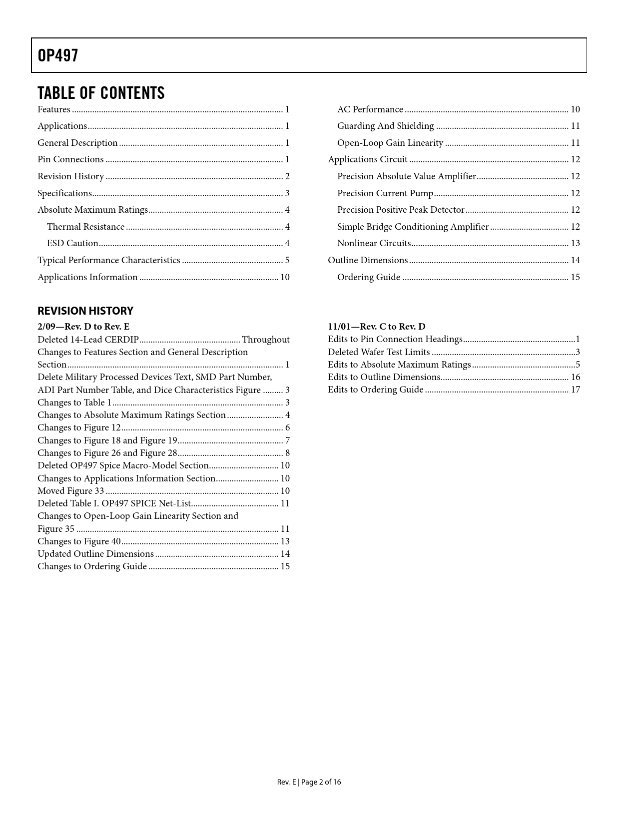 link to page 1 link to page 1 link to page 1 link to page 1 link to page 2 link to page 3 link to page 4 link to page 4 link to page 4 link to page 5 link to page 10 link to page 10 link to page 11 link to page 11 link to page 12 link to page 12 link to page 12 link to page 12 link to page 12 link to page 13 link to page 14 link to page 15 OP497TABLE OF CONTENTS Features .. 1 AC Performance ... 10 Applications ... 1 Guarding And Shielding ... 11 General Description ... 1 Open-Loop Gain Linearity ... 11 Pin Connections ... 1 Applications Circuit ... 12 Revision History ... 2 Precision Absolute Value Amplifier ... 12 Specifications ... 3 Precision Current Pump .. 12 Absolute Maximum Ratings .. 4 Precision Positive Peak Detector .. 12 Thermal Resistance .. 4 Simple Bridge Conditioning Amplifier ... 12 ESD Caution .. 4 Nonlinear Circuits .. 13 Typical Performance Characteristics ... 5 Outline Dimensions ... 14 Applications Information .. 10 Ordering Guide .. 15 REVISION HISTORY2/09—Rev. D to Rev. E11/01—Rev. C to Rev. D Deleted 14-Lead CERDIP ... Throughout Edits to Pin Connection Headings .. 1 Changes to Features Section and General Description Deleted Wafer Test Limits .. 3 Section .. 1 Edits to Absolute Maximum Ratings .. 5 Delete Military Processed Devices Text, SMD Part Number, Edits to Outline Dimensions ... 16 ADI Part Number Table, and Dice Characteristics Figure ... 3 Edits to Ordering Guide .. 17 Changes to Table 1 .. 3 Changes to Absolute Maximum Ratings Section ... 4 Changes to Figure 12 .. 6 Changes to Figure 18 and Figure 19 ... 7 Changes to Figure 26 and Figure 28 ... 8 Deleted OP497 Spice Macro-Model Section ... 10 Changes to Applications Information Section .. 10 Moved Figure 33 ... 10 Deleted Table I. OP497 SPICE Net-List... 11 Changes to Open-Loop Gain Linearity Section and Figure 35 .. 11 Changes to Figure 40 .. 13 Updated Outline Dimensions ... 14 Changes to Ordering Guide .. 15 Rev. E | Page 2 of 16 Document Outline FEATURES APPLICATIONS GENERAL DESCRIPTION PIN CONNECTIONS TABLE OF CONTENTS REVISION HISTORY SPECIFICATIONS ABSOLUTE MAXIMUM RATINGS THERMAL RESISTANCE ESD CAUTION TYPICAL PERFORMANCE CHARACTERISTICS APPLICATIONS INFORMATION AC PERFORMANCE GUARDING AND SHIELDING OPEN-LOOP GAIN LINEARITY APPLICATIONS CIRCUIT PRECISION ABSOLUTE VALUE AMPLIFIER PRECISION CURRENT PUMP PRECISION POSITIVE PEAK DETECTOR SIMPLE BRIDGE CONDITIONING AMPLIFIER NONLINEAR CIRCUITS OUTLINE DIMENSIONS ORDERING GUIDE