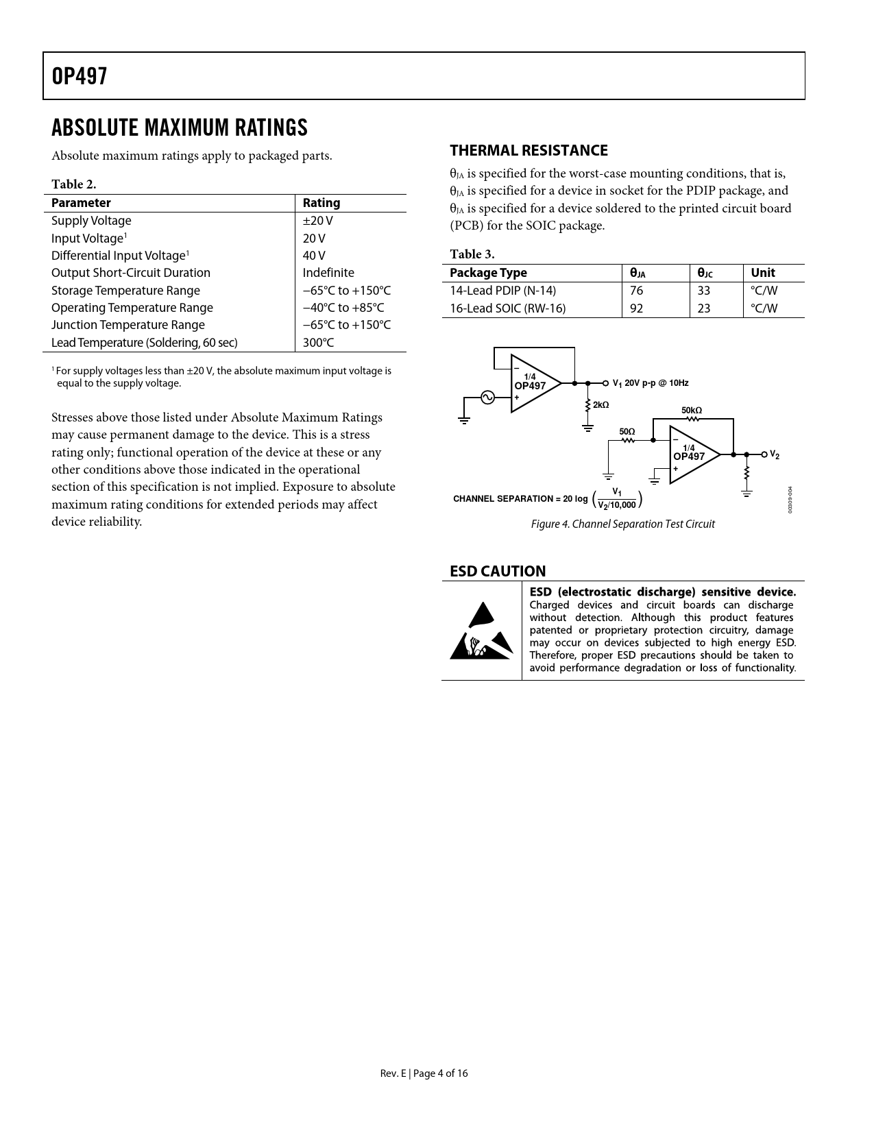 OP497. ABSOLUTE MAXIMUM RATINGS. THERMAL RESISTANCE. Table 2. Parameter Rating. Table 3. Package Type. θJA. θJC Unit. 1/4
