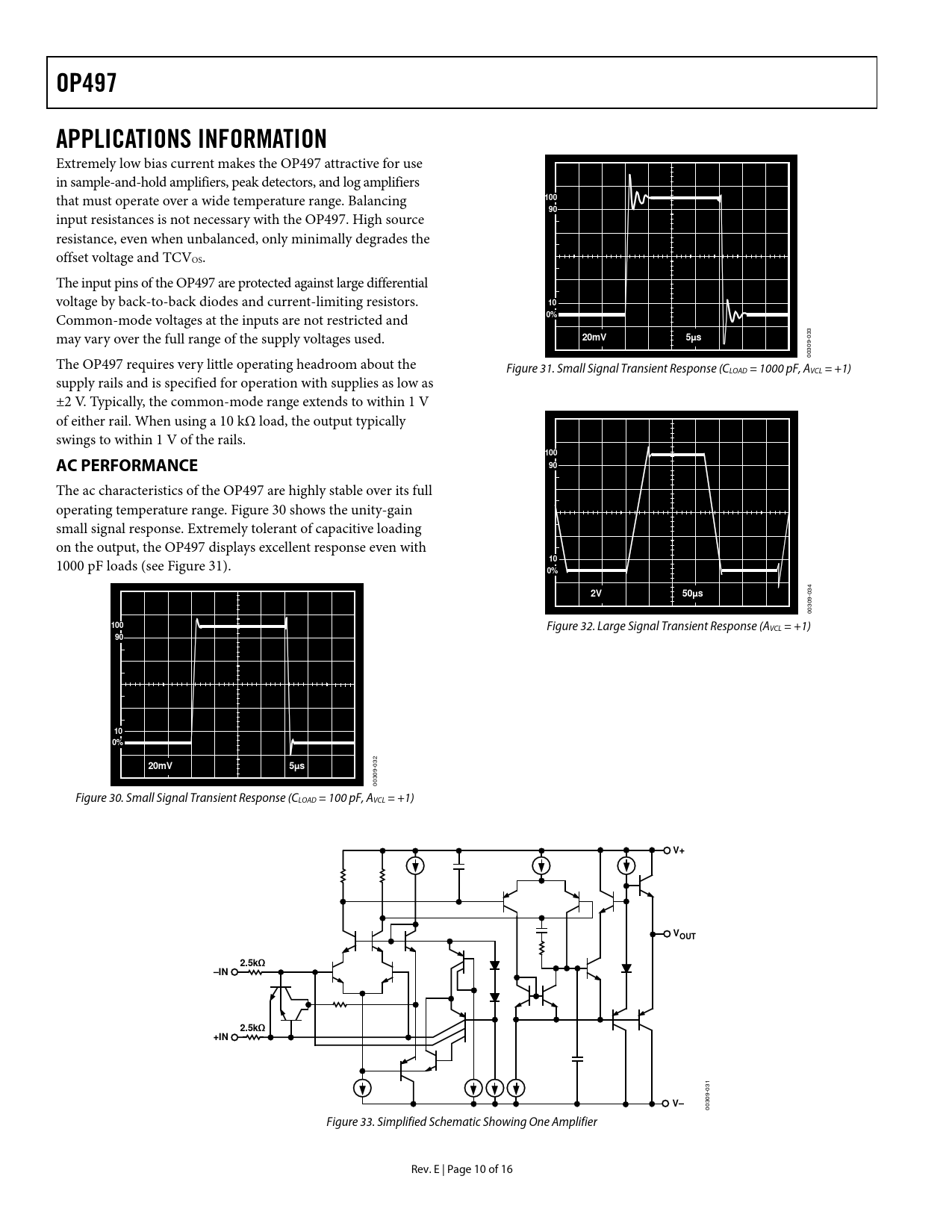 OP497 APPLICATIONS INFORMATION 100 20mV 5µs AC PERFORMANCE 50µs VOUT 2.5kΩ –IN +IN