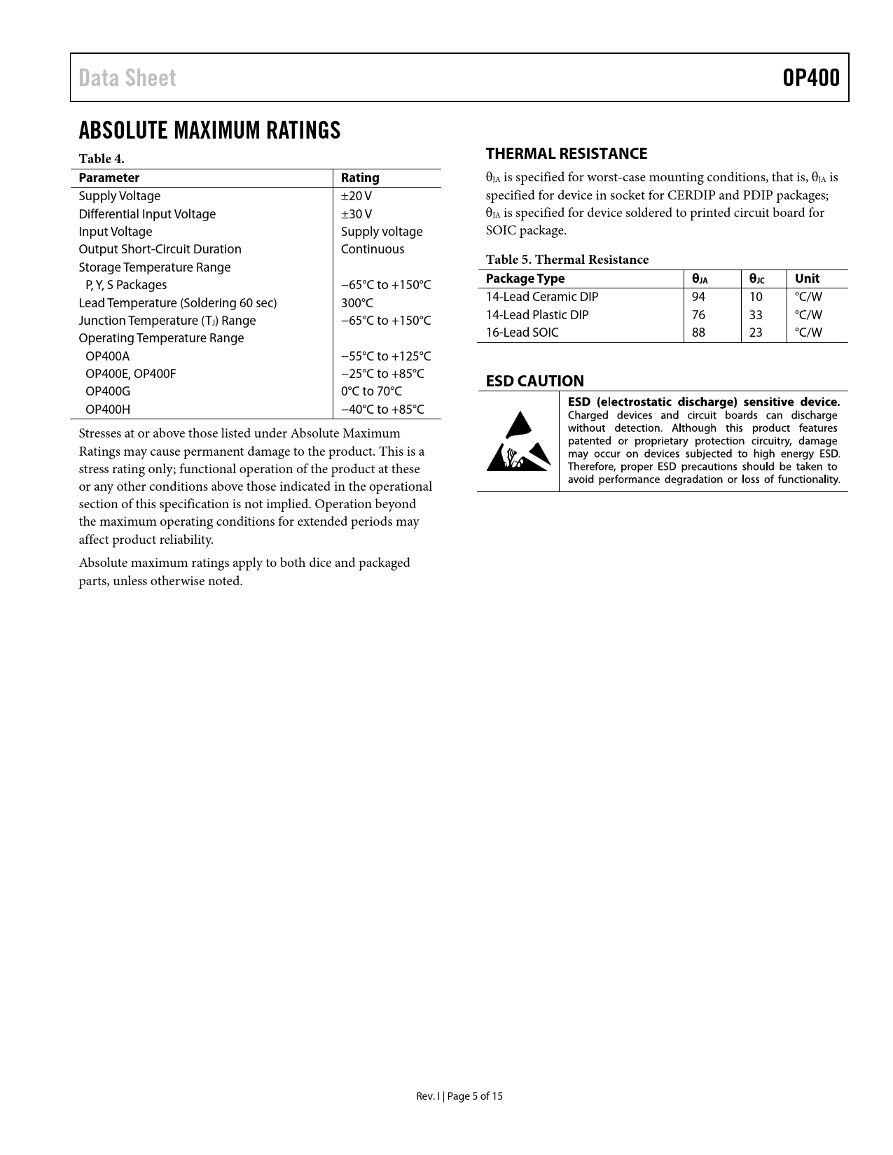 Data SheetOP400ABSOLUTE MAXIMUM RATINGS Table 4.THERMAL RESISTANCEParameter Rating θJA is specified for worst-case mounting conditions, that is, θJA is Supply Voltage ±20 V specified for device in socket for CERDIP and PDIP packages; Differential Input Voltage ±30 V θJA is specified for device soldered to printed circuit board for Input Voltage Supply voltage SOIC package. Output Short-Circuit Duration Continuous Table 5. Thermal Resistance Storage Temperature Range Package Typeθ P, Y, S Packages −65°C to +150°C JAθJCUnit Lead Temperature (Soldering 60 sec) 300°C 14-Lead Ceramic DIP 94 10 °C/W Junction Temperature (T 14-Lead Plastic DIP 76 33 °C/W J) Range −65°C to +150°C Operating Temperature Range 16-Lead SOIC 88 23 °C/W OP400A −55°C to +125°C OP400E, OP400F −25°C to +85°C ESD CAUTION OP400G 0°C to 70°C OP400H −40°C to +85°C Stresses at or above those listed under Absolute Maximum Ratings may cause permanent damage to the product. This is a stress rating only; functional operation of the product at these or any other conditions above those indicated in the operational section of this specification is not implied. Operation beyond the maximum operating conditions for extended periods may affect product reliability. Absolute maximum ratings apply to both dice and packaged parts, unless otherwise noted. Rev. I | Page 5 of 15 Document Outline Features Functional Block Diagrams General Description Table of Contents Revision History Specifications Electrical Characteristics Absolute Maximum Ratings Thermal Resistance ESD Caution Typical Performance Characteristics Applications Information Dual Low Power Instrumentation Amplifier Bipolar Current Transmitter Differential Output Instrumentation Amplifier Multiple Output Tracking Voltage Reference Outline Dimensions Ordering Guide SMD Parts and Equivalents