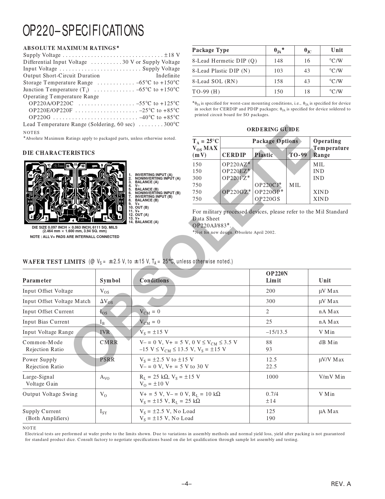 OP220–SPECIFICATIONS ABSOLUTE MAXIMUM RATINGS* Package Type JA* Unit ORDERING GUIDE TA = 25 C Package Options Operating VOS MAX