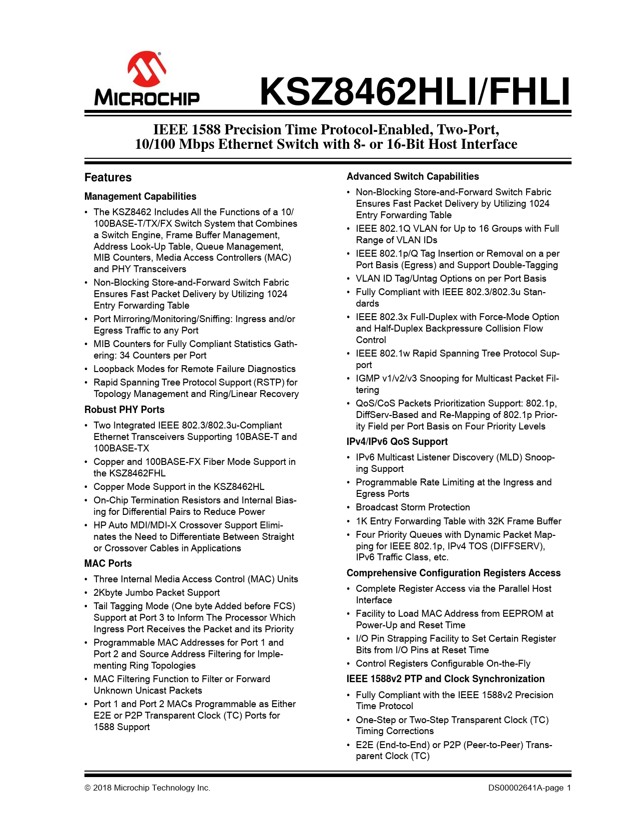 KSZ8462HLI/FHLIIEEE 1588 Precision Time Protocol-Enabled, Two-Port,10/100 Mbps Ethernet Switch with 8- or 16-Bit Host InterfaceFeaturesAdvanced Switch Capabilities • Non-Blocking Store-and-Forward Switch Fabric Management Capabilities Ensures Fast Packet Delivery by Utilizing 1024 • The KSZ8462 Includes All the Functions of a 10/ Entry Forwarding Table 100BASE-T/TX/FX Switch System that Combines • IEEE 802.1Q VLAN for Up to 16 Groups with Full a Switch Engine, Frame Buffer Management, Range of VLAN IDs Address Look-Up Table, Queue Management, MIB Counters, Media Access Controllers (MAC) • IEEE 802.1p/Q Tag Insertion or Removal on a per and PHY Transceivers Port Basis (Egress) and Support Double-Tagging • Non-Blocking Store-and-Forward Switch Fabric • VLAN ID Tag/Untag Options on per Port Basis Ensures Fast Packet Delivery by Utilizing 1024 • Fully Compliant with IEEE 802.3/802.3u Stan- Entry Forwarding Table dards • Port Mirroring/Monitoring/Sniffing: Ingress and/or • IEEE 802.3x Full-Duplex with Force-Mode Option Egress Traffic to any Port and Half-Duplex Backpressure Collision Flow • MIB Counters for Fully Compliant Statistics Gath- Control ering: 34 Counters per Port • IEEE 802.1w Rapid Spanning Tree Protocol Sup- • Loopback Modes for Remote Failure Diagnostics port • Rapid Spanning Tree Protocol Support (RSTP) for • IGMP v1/v2/v3 Snooping for Multicast Packet Fil- Topology Management and Ring/Linear Recovery tering • QoS/CoS Packets Prioritization Support: 802.1p, Robust PHY Ports DiffServ-Based and Re-Mapping of 802.1p Prior- • Two Integrated IEEE 802.3/802.3u-Compliant ity Field per Port Basis on Four Priority Levels Ethernet Transceivers Supporting 10BASE-T and IPv4/IPv6 QoS Support 100BASE-TX • Copper and 100BASE-FX Fiber Mode Support in • IPv6 Multicast Listener Discovery (MLD) Snoop- the KSZ8462FHL ing Support • Copper Mode Support in the KSZ8462HL • Programmable Rate Limiting at the Ingress and Egress Ports • On-Chip Termination Resistors and Internal Bias- ing for Differential Pairs to Reduce Power • Broadcast Storm Protection • HP Auto MDI/MDI-X Crossover Support Elimi- • 1K Entry Forwarding Table with 32K Frame Buffer nates the Need to Differentiate Between Straight • Four Priority Queues with Dynamic Packet Map- or Crossover Cables in Applications ping for IEEE 802.1p, IPv4 TOS (DIFFSERV), IPv6 Traffic Class, etc. MAC PortsComprehensive Configuration Registers Access • Three Internal Media Access Control (MAC) Units • 2Kbyte Jumbo Packet Support • Complete Register Access via the Parallel Host Interface • Tail Tagging Mode (One byte Added before FCS) Support at Port 3 to Inform The Processor Which • Facility to Load MAC Address from EEPROM at Ingress Port Receives the Packet and its Priority Power-Up and Reset Time • Programmable MAC Addresses for Port 1 and • I/O Pin Strapping Facility to Set Certain Register Port 2 and Source Address Filtering for Imple- Bits from I/O Pins at Reset Time menting Ring Topologies • Control Registers Configurable On-the-Fly • MAC Filtering Function to Filter or Forward IEEE 1588v2 PTP and Clock Synchronization Unknown Unicast Packets • Fully Compliant with the IEEE 1588v2 Precision • Port 1 and Port 2 MACs Programmable as Either Time Protocol E2E or P2P Transparent Clock (TC) Ports for • One-Step or Two-Step Transparent Clock (TC) 1588 Support Timing Corrections • E2E (End-to-End) or P2P (Peer-to-Peer) Trans- parent Clock (TC) 2018 Microchip Technology Inc. DS00002641A-page 1 Document Outline 1.0 Introduction 1.1 General Terms and Conditions 1.2 General Description 2.0 Pin Description and Configuration 3.0 Functional Description 3.1 Direction Terminology 3.2 Physical (PHY) Block 3.3 Media Access Controller (MAC) Block 3.4 Switch Block 3.5 Queue Management Unit (QMU) 3.6 IEEE 1588 Precision Time Protocol (PTP) Block 3.7 General Purpose and IEEE 1588 Input/Output (GPIO) 3.8 Using the GPIO Pins with the Trigger Output Units 3.9 Using the GPIO Pins with the Time Stamp Input Units 3.10 Device Clocks 3.11 Power 3.12 Power Management 3.13 Interfaces 4.0 Register Descriptions 4.1 Register Map of CPU Accessible I/O Registers 4.2 Register Bit Definitions 4.3 Management Information Base (MIB) Counters 4.4 Static MAC Address Table 4.5 Dynamic MAC Address Table 4.6 VLAN Table 5.0 Operational Characteristics 5.1 Absolute Maximum Ratings* 5.2 Operating Ratings** 6.0 Electrical Characteristics 7.0 Timing Specifications 7.1 Host Interface Read/Write Timing 7.2 Auto-Negotiation Timing 7.3 Trigger Output Unit and Time Stamp Input Unit Timing 7.4 Serial EEPROM Interface Timing 7.5 Reset and Power Sequence Timing 7.6 Reset Circuit Guidelines 8.0 Reference Circuit: LED Strap-In Pins 9.0 Reference Clock: Connection and Selection 10.0 Selection of Isolation Transformers 11.0 Package Outline Appendix A: Data Sheet Revision History The Microchip Web Site Customer Change Notification Service Customer Support Product Identification System Worldwide Sales and Service