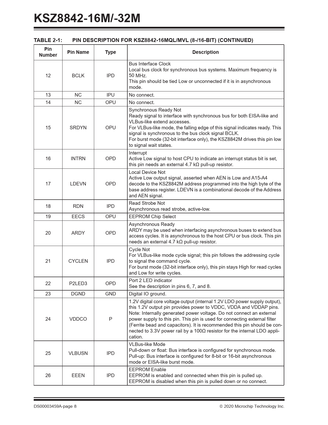 KSZ8842-16M/-32MTABLE 2-1:PIN DESCRIPTION FOR KSZ8842-16MQL/MVL (8-/16-BIT) (CONTINUED)PinPin NameTypeDescriptionNumber Bus Interface Clock Local bus clock for synchronous bus systems. Maximum frequency is 12 BCLK IPD 50 MHz. This pin should be tied Low or unconnected if it is in asynchronous mode. 13 NC IPU No connect. 14 NC OPU No connect. Synchronous Ready Not Ready signal to interface with synchronous bus for both EISA-like and VLBus-like extend accesses. 15 SRDYN OPU For VLBus-like mode, the falling edge of this signal indicates ready. This signal is synchronous to the bus clock signal BCLK. For burst mode (32-bit interface only), the KSZ8842M drives this pin low to signal wait states. Interrupt 16 INTRN OPD Active Low signal to host CPU to indicate an interrupt status bit is set, this pin needs an external 4.7 kΩ pull-up resistor. Local Device Not Active Low output signal, asserted when AEN is Low and A15-A4 17 LDEVN OPD decode to the KSZ8842M address programmed into the high byte of the base address register. LDEVN is a combinational decode of the Address and AEN signal. Read Strobe Not 18 RDN IPD Asynchronous read strobe, active-low. 19 EECS OPU EEPROM Chip Select Asynchronous Ready ARDY may be used when interfacing asynchronous buses to extend bus 20 ARDY OPD access cycles. It is asynchronous to the host CPU or bus clock. This pin needs an external 4.7 kΩ pull-up resistor. Cycle Not For VLBus-like mode cycle signal; this pin follows the addressing cycle 21 CYCLEN IPD to signal the command cycle. For burst mode (32-bit interface only), this pin stays High for read cycles and Low for write cycles. Port 2 LED indicator 22 P2LED3 OPD See the description in pins 6, 7, and 8. 23 DGND GND Digital IO ground. 1.2V digital core voltage output (internal 1.2V LDO power supply output), this 1.2V output pin provides power to VDDC, VDDA and VDDAP pins. Note: Internally generated power voltage. Do not connect an external 24 VDDCO P power supply to this pin. This pin is used for connecting external filter (Ferrite bead and capacitors). It is recommended this pin should be con- nected to 3.3V power rail by a 100Ω resistor for the internal LDO appli- cation. VLBus-like Mode Pull-down or float: Bus interface is configured for synchronous mode. 25 VLBUSN IPD Pull-up: Bus interface is configured for 8-bit or 16-bit asynchronous mode or EISA-like burst mode. EEPROM Enable 26 EEEN IPD EEPROM is enabled and connected when this pin is pulled up. EEPROM is disabled when this pin is pulled down or no connect. DS00003459A-page 8 2020 Microchip Technology Inc. Document Outline 1.0 Introduction 1.1 General Description 2.0 Pin Description and Configuration 3.0 Functional Description 3.1 Functional Overview: Physical Layer Transceiver 3.2 Functional Overview: MAC and Switch 3.3 Bus Interface Unit (BIU) 3.4 Queue Management Unit (QMU) 3.5 Advanced Switch Functions 3.6 IEEE 802.1Q VLAN Support 3.7 QoS Priority Support 3.8 Rate-Limiting Support 3.9 Loopback Support 4.0 Register Descriptions 4.1 CPU Interface I/O Registers 4.2 Register Map: MAC and PHY 4.3 Type-of-Service (TOS) Priority Control Registers 4.4 Management Information Base (MIB) Counters 4.5 Static MAC Address Table 4.6 Dynamic MAC Address Table 4.7 VLAN Table 5.0 Operational Characteristics 5.1 Absolute Maximum Ratings* 5.2 Operating Ratings** 6.0 Electrical Characteristics 7.0 Timing Specifications 7.1 Asynchronous Timing without using Address Strobe (ADSN = 0) 7.2 Asynchronous Timing using Address Strobe (ADSN) 7.3 Asynchronous Timing using DATACSN (KSZ8842-32MQL/MVL Only) 7.4 Address Latching Timing for All Modes 7.5 Synchronous Timing in Burst Write (VLBUSN = 1) 7.6 Synchronous Timing in Burst Read (VLBUSN = 1) 7.7 Synchronous Write Timing (VLBUSN = 0) 7.8 Synchronous Read Timing (VLBUSN = 0) 7.9 EEPROM Timing 7.10 Auto-Negotiation Timing 7.11 Reset Timing 8.0 Selection of Isolation Transformers 9.0 Package Outline 9.1 Package Marking Information Appendix A: Data Sheet Revision History The Microchip Website Customer Change Notification Service Customer Support Product Identification System Worldwide Sales and Service