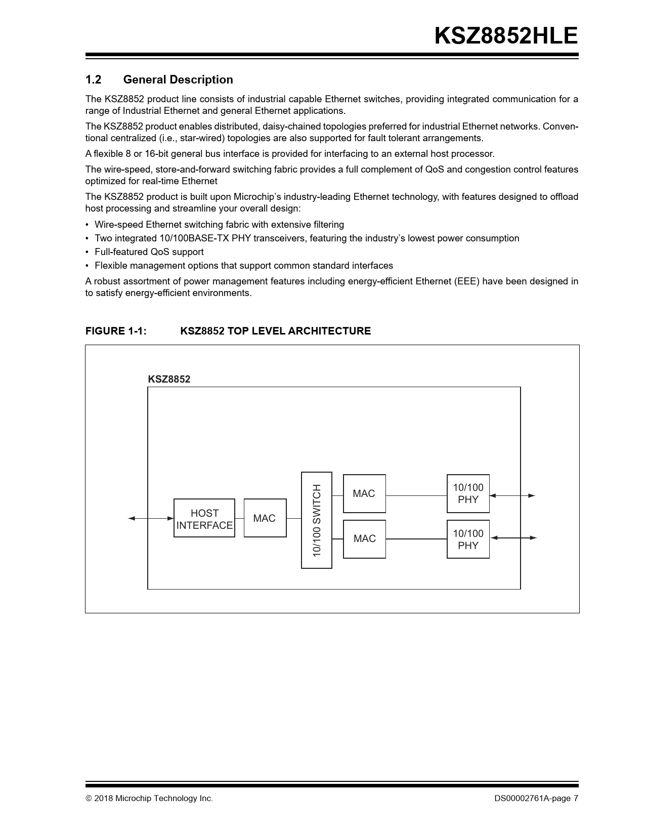 KSZ8852HLE1.2General Description The KSZ8852 product line consists of industrial capable Ethernet switches, providing integrated communication for a range of Industrial Ethernet and general Ethernet applications. The KSZ8852 product enables distributed, daisy-chained topologies preferred for industrial Ethernet networks. Conven- tional centralized (i.e., star-wired) topologies are also supported for fault tolerant arrangements. A flexible 8 or 16-bit general bus interface is provided for interfacing to an external host processor. The wire-speed, store-and-forward switching fabric provides a full complement of QoS and congestion control features optimized for real-time Ethernet The KSZ8852 product is built upon Microchip’s industry-leading Ethernet technology, with features designed to offload host processing and streamline your overall design: • Wire-speed Ethernet switching fabric with extensive filtering • Two integrated 10/100BASE-TX PHY transceivers, featuring the industry’s lowest power consumption • Full-featured QoS support • Flexible management options that support common standard interfaces A robust assortment of power management features including energy-efficient Ethernet (EEE) have been designed in to satisfy energy-efficient environments. FIGURE 1-1:KSZ8852 TOP LEVEL ARCHITECTUREKSZ8852 10/100 MAC PHY HOST MAC INTERFACE 10/100 MAC PHY 10/100 SWITCH 2018 Microchip Technology Inc. DS00002761A-page 7 Document Outline 1.0 Introduction 1.1 General Terms and Conditions 1.2 General Description 2.0 Pin Description and Configuration 3.0 Functional Description 3.1 Direction Terminology 3.2 Physical (PHY) Block 3.3 MDI/MDI−X Auto Crossover 3.4 Auto Negotiation 3.5 LINK MD® Cable Diagnostics 3.6 On-Chip Termination Resistors 3.7 Lookback Support 3.8 MAC (Media Access Controller) Block 3.9 Switch Block 3.10 IGMP Support 3.11 IPv6 MLD Snooping 3.12 Port Mirroring Support 3.13 IEEE 802.1Q VLAN Support 3.14 QoS Priority Support 3.15 Rate-Limiting Support 3.16 MAC Address Filtering Function 3.17 Queue Management Unit (QMU) 3.18 Device Clocks 3.19 Power 3.20 Internal Low Voltage LDO Regulator 3.21 Power Management 3.22 Wake-On-LAN 3.23 Interfaces 4.0 Register Descriptions 4.1 Device Registers 4.2 Register Map of CPU Accessible I/O Registers 4.3 Register Bit Definitions 4.4 Type-of-Service (TOS) Priority Control Registers 4.5 Indirect Access Data Registers 4.6 Power Management Control and Wake-Up Event Status 4.7 Go Sleep Time and Clock Tree Power-Down Control Registers 4.8 PHY and MII Basic Control Registers 4.9 Port 1 Control Registers 4.10 Port 2 Control Registers 4.11 Port 3 Control Registers 4.12 Switch Global Control Registers 4.13 Source Address Filtering Registers 4.14 TXQ Rate Control Registers 4.15 Auto-Negotiation Next Page Registers 4.16 EEE and Link Partner Advertisement Registers 4.17 Internal I/O Register Space Mapping for Interrupts, BIU, and Global Reset (0x100 - 0x1FF) 4.18 Host MAC Address Registers: MARL, MARM, and MARH 4.19 Internal I/O Register Space Mapping for the Queue Management Unit (QMU) (0x170 - 0x1FF) 4.20 Internal I/O Register Space Mapping for Interrupt Registers (0x190 - 0x193) 4.21 Internal I/O Register Space Mapping for the Queue Management Unit (QMU) (0x19C - 0x1B9) 4.22 Management Information Base (MIB) Counters 4.23 Static MAC Address Table 4.24 Dynamic MAC Address Table 4.25 VLAN Table 5.0 Operational Characteristics 5.1 Absolute Maximum Ratings* 5.2 Operating Ratings** 6.0 Electrical Characteristics 7.0 Timing Specifications 7.1 Host Interface Read / Write Timing 7.2 Auto-Negotiation Timing 7.3 Serial EEPROM Interface Timing 7.4 Reset Timing and Power Sequencing 7.5 Reset Circuit Guidelines 7.6 Reference Circuits – LED Strap-In Pins 7.7 Reference Clock – Connection and Selection 8.0 Selection of Isolation Transformers 9.0 Package Outline Appendix A: Data Sheet Revision History The Microchip Web Site Customer Change Notification Service Customer Support Product Identification System Worldwide Sales and Service