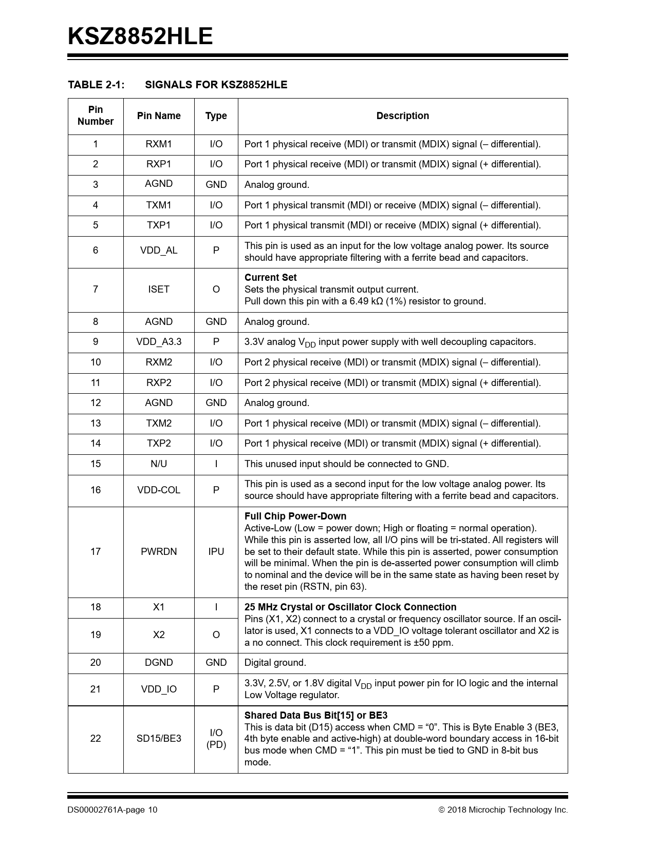 KSZ8852HLETABLE 2-1:SIGNALS FOR KSZ8852HLEPinPin NameTypeDescriptionNumber 1 RXM1 I/O Port 1 physical receive (MDI) or transmit (MDIX) signal (– differential). 2 RXP1 I/O Port 1 physical receive (MDI) or transmit (MDIX) signal (+ differential). 3 AGND GND Analog ground. 4 TXM1 I/O Port 1 physical transmit (MDI) or receive (MDIX) signal (– differential). 5 TXP1 I/O Port 1 physical transmit (MDI) or receive (MDIX) signal (+ differential). 6 VDD_AL P This pin is used as an input for the low voltage analog power. Its source should have appropriate filtering with a ferrite bead and capacitors. Current Set 7 ISET O Sets the physical transmit output current. Pull down this pin with a 6.49 kΩ (1%) resistor to ground. 8 AGND GND Analog ground. 9 VDD_A3.3 P 3.3V analog VDD input power supply with well decoupling capacitors. 10 RXM2 I/O Port 2 physical receive (MDI) or transmit (MDIX) signal (– differential). 11 RXP2 I/O Port 2 physical receive (MDI) or transmit (MDIX) signal (+ differential). 12 AGND GND Analog ground. 13 TXM2 I/O Port 1 physical receive (MDI) or transmit (MDIX) signal (– differential). 14 TXP2 I/O Port 1 physical receive (MDI) or transmit (MDIX) signal (+ differential). 15 N/U I This unused input should be connected to GND. This pin is used as a second input for the low voltage analog power. Its 16 VDD-COL P source should have appropriate filtering with a ferrite bead and capacitors. Full Chip Power-Down Active-Low (Low = power down; High or floating = normal operation). While this pin is asserted low, all I/O pins will be tri-stated. All registers will 17 PWRDN IPU be set to their default state. While this pin is asserted, power consumption will be minimal. When the pin is de-asserted power consumption will climb to nominal and the device will be in the same state as having been reset by the reset pin (RSTN, pin 63). 18 X1 I 25 MHz Crystal or Oscillator Clock Connection Pins (X1, X2) connect to a crystal or frequency oscillator source. If an oscil- lator is used, X1 connects to a VDD_IO voltage tolerant oscillator and X2 is 19 X2 O a no connect. This clock requirement is ±50 ppm. 20 DGND GND Digital ground. 3.3V, 2.5V, or 1.8V digital V 21 VDD_IO P DD input power pin for IO logic and the internal Low Voltage regulator. Shared Data Bus Bit[15] or BE3 This is data bit (D15) access when CMD = “0”. This is Byte Enable 3 (BE3, I/O 22 SD15/BE3 4th byte enable and active-high) at double-word boundary access in 16-bit (PD) bus mode when CMD = “1”. This pin must be tied to GND in 8-bit bus mode. DS00002761A-page 10 2018 Microchip Technology Inc. Document Outline 1.0 Introduction 1.1 General Terms and Conditions 1.2 General Description 2.0 Pin Description and Configuration 3.0 Functional Description 3.1 Direction Terminology 3.2 Physical (PHY) Block 3.3 MDI/MDI−X Auto Crossover 3.4 Auto Negotiation 3.5 LINK MD® Cable Diagnostics 3.6 On-Chip Termination Resistors 3.7 Lookback Support 3.8 MAC (Media Access Controller) Block 3.9 Switch Block 3.10 IGMP Support 3.11 IPv6 MLD Snooping 3.12 Port Mirroring Support 3.13 IEEE 802.1Q VLAN Support 3.14 QoS Priority Support 3.15 Rate-Limiting Support 3.16 MAC Address Filtering Function 3.17 Queue Management Unit (QMU) 3.18 Device Clocks 3.19 Power 3.20 Internal Low Voltage LDO Regulator 3.21 Power Management 3.22 Wake-On-LAN 3.23 Interfaces 4.0 Register Descriptions 4.1 Device Registers 4.2 Register Map of CPU Accessible I/O Registers 4.3 Register Bit Definitions 4.4 Type-of-Service (TOS) Priority Control Registers 4.5 Indirect Access Data Registers 4.6 Power Management Control and Wake-Up Event Status 4.7 Go Sleep Time and Clock Tree Power-Down Control Registers 4.8 PHY and MII Basic Control Registers 4.9 Port 1 Control Registers 4.10 Port 2 Control Registers 4.11 Port 3 Control Registers 4.12 Switch Global Control Registers 4.13 Source Address Filtering Registers 4.14 TXQ Rate Control Registers 4.15 Auto-Negotiation Next Page Registers 4.16 EEE and Link Partner Advertisement Registers 4.17 Internal I/O Register Space Mapping for Interrupts, BIU, and Global Reset (0x100 - 0x1FF) 4.18 Host MAC Address Registers: MARL, MARM, and MARH 4.19 Internal I/O Register Space Mapping for the Queue Management Unit (QMU) (0x170 - 0x1FF) 4.20 Internal I/O Register Space Mapping for Interrupt Registers (0x190 - 0x193) 4.21 Internal I/O Register Space Mapping for the Queue Management Unit (QMU) (0x19C - 0x1B9) 4.22 Management Information Base (MIB) Counters 4.23 Static MAC Address Table 4.24 Dynamic MAC Address Table 4.25 VLAN Table 5.0 Operational Characteristics 5.1 Absolute Maximum Ratings* 5.2 Operating Ratings** 6.0 Electrical Characteristics 7.0 Timing Specifications 7.1 Host Interface Read / Write Timing 7.2 Auto-Negotiation Timing 7.3 Serial EEPROM Interface Timing 7.4 Reset Timing and Power Sequencing 7.5 Reset Circuit Guidelines 7.6 Reference Circuits – LED Strap-In Pins 7.7 Reference Clock – Connection and Selection 8.0 Selection of Isolation Transformers 9.0 Package Outline Appendix A: Data Sheet Revision History The Microchip Web Site Customer Change Notification Service Customer Support Product Identification System Worldwide Sales and Service