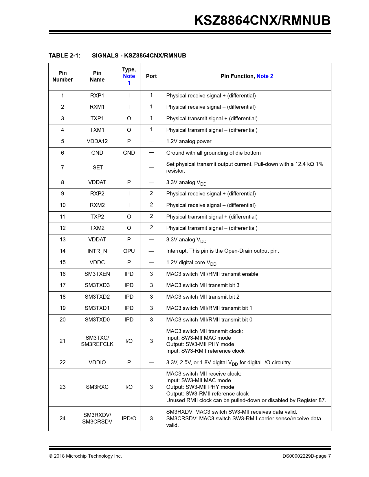 KSZ8864CNX/RMNUB. TABLE 2-1:. SIGNALS - KSZ8864CNX/RMNUB. Type,. Pin. Note. Port. Pin Function, Note 2. Number. Name