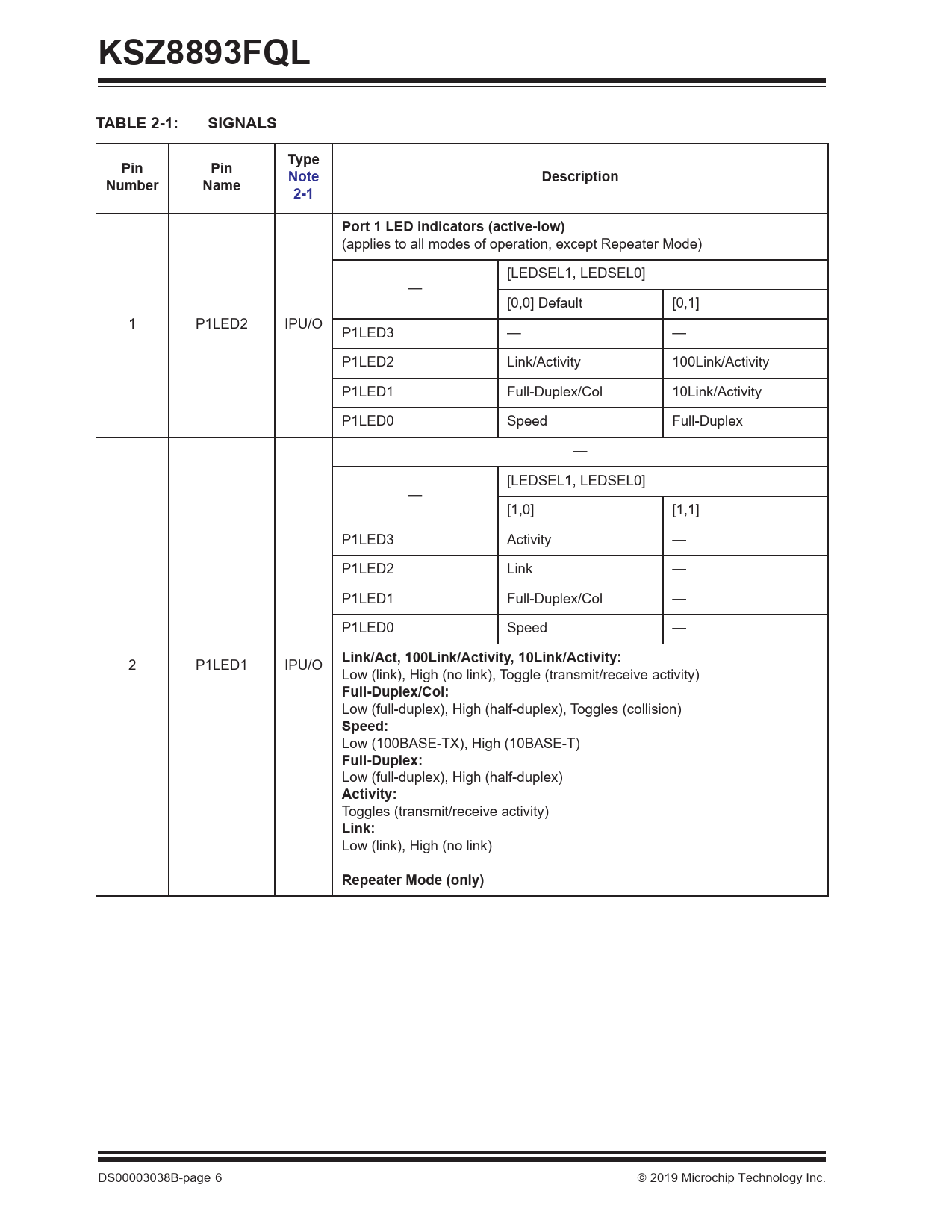 KSZ8893FQL. TABLE 2-1:. SIGNALS. Type. Pin. Note. Description. Number. Name. 2-1. Port 1 LED indicators (active-low)
