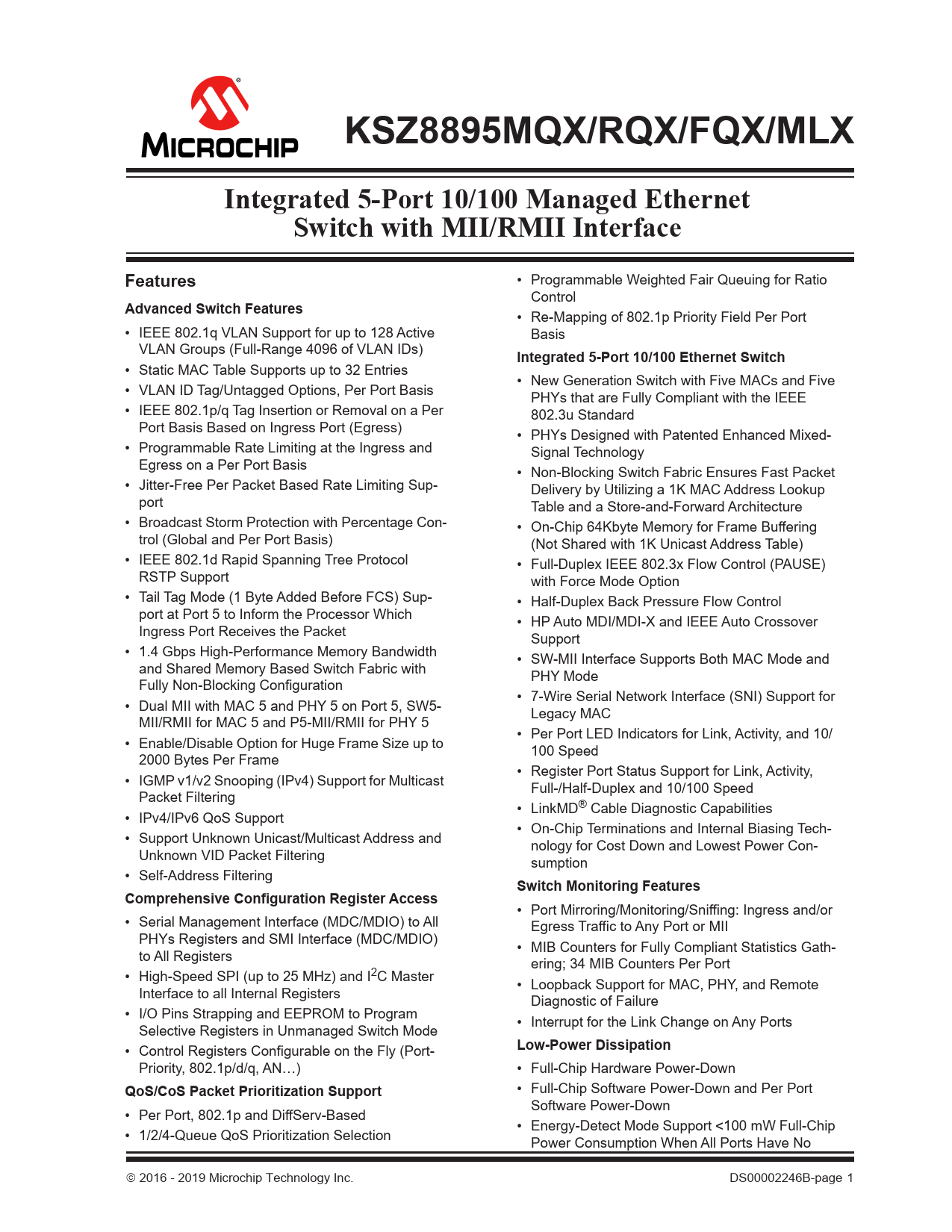 KSZ8895MQX/RQX/FQX/MLXIntegrated 5-Port 10/100 Managed EthernetSwitch with MII/RMII InterfaceFeatures • Programmable Weighted Fair Queuing for Ratio Control Advanced Switch Features • Re-Mapping of 802.1p Priority Field Per Port • IEEE 802.1q VLAN Support for up to 128 Active Basis VLAN Groups (Full-Range 4096 of VLAN IDs) Integrated 5-Port 10/100 Ethernet Switch • Static MAC Table Supports up to 32 Entries • New Generation Switch with Five MACs and Five • VLAN ID Tag/Untagged Options, Per Port Basis PHYs that are Fully Compliant with the IEEE • IEEE 802.1p/q Tag Insertion or Removal on a Per 802.3u Standard Port Basis Based on Ingress Port (Egress) • PHYs Designed with Patented Enhanced Mixed- • Programmable Rate Limiting at the Ingress and Signal Technology Egress on a Per Port Basis • Non-Blocking Switch Fabric Ensures Fast Packet • Jitter-Free Per Packet Based Rate Limiting Sup- Delivery by Utilizing a 1K MAC Address Lookup port Table and a Store-and-Forward Architecture • Broadcast Storm Protection with Percentage Con- • On-Chip 64Kbyte Memory for Frame Buffering trol (Global and Per Port Basis) (Not Shared with 1K Unicast Address Table) • IEEE 802.1d Rapid Spanning Tree Protocol • Full-Duplex IEEE 802.3x Flow Control (PAUSE) RSTP Support with Force Mode Option • Tail Tag Mode (1 Byte Added Before FCS) Sup- • Half-Duplex Back Pressure Flow Control port at Port 5 to Inform the Processor Which • HP Auto MDI/MDI-X and IEEE Auto Crossover Ingress Port Receives the Packet Support • 1.4 Gbps High-Performance Memory Bandwidth • SW-MII Interface Supports Both MAC Mode and and Shared Memory Based Switch Fabric with PHY Mode Fully Non-Blocking Configuration • 7-Wire Serial Network Interface (SNI) Support for • Dual MII with MAC 5 and PHY 5 on Port 5, SW5- Legacy MAC MII/RMII for MAC 5 and P5-MII/RMII for PHY 5 • Per Port LED Indicators for Link, Activity, and 10/ • Enable/Disable Option for Huge Frame Size up to 100 Speed 2000 Bytes Per Frame • Register Port Status Support for Link, Activity, • IGMP v1/v2 Snooping (IPv4) Support for Multicast Full-/Half-Duplex and 10/100 Speed Packet Filtering • LinkMD® Cable Diagnostic Capabilities • IPv4/IPv6 QoS Support • On-Chip Terminations and Internal Biasing Tech- • Support Unknown Unicast/Multicast Address and nology for Cost Down and Lowest Power Con- Unknown VID Packet Filtering sumption • Self-Address Filtering Switch Monitoring FeaturesComprehensive Configuration Register Access • Port Mirroring/Monitoring/Sniffing: Ingress and/or • Serial Management Interface (MDC/MDIO) to All Egress Traffic to Any Port or MII PHYs Registers and SMI Interface (MDC/MDIO) • MIB Counters for Fully Compliant Statistics Gath- to All Registers ering; 34 MIB Counters Per Port • High-Speed SPI (up to 25 MHz) and I2C Master • Loopback Support for MAC, PHY, and Remote Interface to all Internal Registers Diagnostic of Failure • I/O Pins Strapping and EEPROM to Program • Interrupt for the Link Change on Any Ports Selective Registers in Unmanaged Switch Mode • Control Registers Configurable on the Fly (Port- Low-Power Dissipation Priority, 802.1p/d/q, AN…) • Full-Chip Hardware Power-Down QoS/CoS Packet Prioritization Support • Full-Chip Software Power-Down and Per Port Software Power-Down • Per Port, 802.1p and DiffServ-Based • Energy-Detect Mode Support <100 mW Full-Chip • 1/2/4-Queue QoS Prioritization Selection Power Consumption When All Ports Have No 2016 - 2019 Microchip Technology Inc. DS00002246B-page 1 Document Outline 1.0 Introduction 1.1 General Description 2.0 Pin Description and Configuration 3.0 Functional Description 3.1 Physical Layer Transceiver 3.2 Power 3.3 Power Management 3.4 Switch Core 3.5 Advanced Functionality 3.6 MII Management (MIIM) Interface 3.7 Serial Management Interface (SMI) 4.0 Register Descriptions 4.1 Global Registers 4.2 Port Registers 4.3 Advanced Control Registers 4.4 Static MAC Address Table 4.5 VLAN Table 4.6 Dynamic MAC Address Table 4.7 Management Information Base (MIB) Counters 4.8 MIIM Registers 5.0 Operational Characteristics 5.1 Absolute Maximum Ratings* 5.2 Operating Ratings*** 6.0 Electrical Characteristics 7.0 Timing Diagrams 7.1 EEPROM Timing 7.2 SNI Timing 7.3 MII Timing 7.4 RMII Timing 7.5 SPI Timing 7.6 Auto-Negotiation Timing 7.7 MDC/MDIO Timing 7.8 Reset Timing 8.0 Reset Circuit 9.0 Selection of Isolation Transformer, (Note 9-1) 10.0 Package Outline Appendix A: Data Sheet Revision History The Microchip Website Customer Change Notification Service Customer Support Product Identification System Worldwide Sales and Service