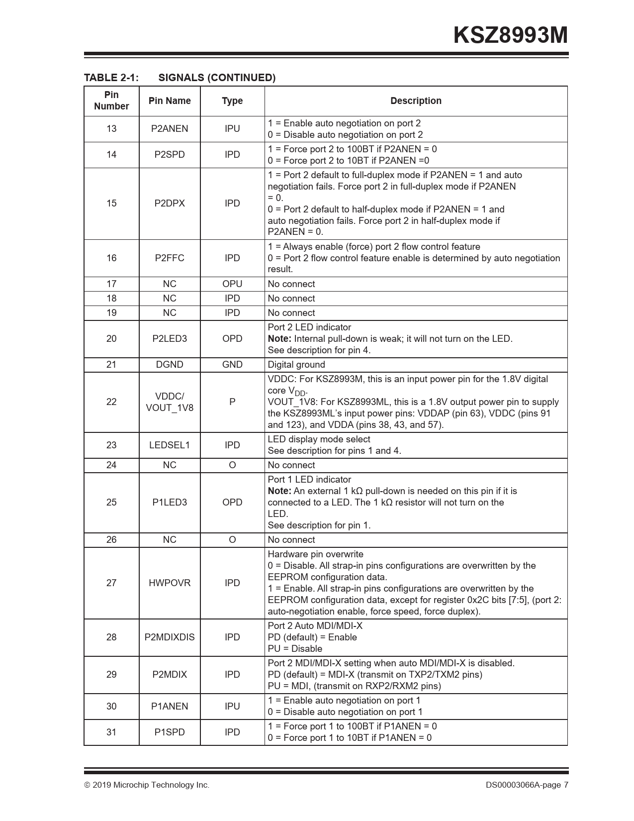 KSZ8993MTABLE 2-1:SIGNALS (CONTINUED)PinPin NameTypeDescriptionNumber 1 = Enable auto negotiation on port 2 13 P2ANEN IPU 0 = Disable auto negotiation on port 2 1 = Force port 2 to 100BT if P2ANEN = 0 14 P2SPD IPD 0 = Force port 2 to 10BT if P2ANEN =0 1 = Port 2 default to full-duplex mode if P2ANEN = 1 and auto negotiation fails. Force port 2 in full-duplex mode if P2ANEN = 0. 15 P2DPX IPD 0 = Port 2 default to half-duplex mode if P2ANEN = 1 and auto negotiation fails. Force port 2 in half-duplex mode if P2ANEN = 0. 1 = Always enable (force) port 2 flow control feature 16 P2FFC IPD 0 = Port 2 flow control feature enable is determined by auto negotiation result. 17 NC OPU No connect 18 NC IPD No connect 19 NC IPD No connect Port 2 LED indicator 20 P2LED3 OPD Note: Internal pull-down is weak; it will not turn on the LED. See description for pin 4. 21 DGND GND Digital ground VDDC: For KSZ8993M, this is an input power pin for the 1.8V digital core V VDDC/ DD. 22 P VOUT_1V8: For KSZ8993ML, this is a 1.8V output power pin to supply VOUT_1V8 the KSZ8993ML’s input power pins: VDDAP (pin 63), VDDC (pins 91 and 123), and VDDA (pins 38, 43, and 57). LED display mode select 23 LEDSEL1 IPD See description for pins 1 and 4. 24 NC O No connect Port 1 LED indicator Note: An external 1 kΩ pull-down is needed on this pin if it is 25 P1LED3 OPD connected to a LED. The 1 kΩ resistor will not turn on the LED. See description for pin 1. 26 NC O No connect Hardware pin overwrite 0 = Disable. All strap-in pins configurations are overwritten by the EEPROM configuration data. 27 HWPOVR IPD 1 = Enable. All strap-in pins configurations are overwritten by the EEPROM configuration data, except for register 0x2C bits [7:5], (port 2: auto-negotiation enable, force speed, force duplex). Port 2 Auto MDI/MDI-X 28 P2MDIXDIS IPD PD (default) = Enable PU = Disable Port 2 MDI/MDI-X setting when auto MDI/MDI-X is disabled. 29 P2MDIX IPD PD (default) = MDI-X (transmit on TXP2/TXM2 pins) PU = MDI, (transmit on RXP2/RXM2 pins) 1 = Enable auto negotiation on port 1 30 P1ANEN IPU 0 = Disable auto negotiation on port 1 1 = Force port 1 to 100BT if P1ANEN = 0 31 P1SPD IPD 0 = Force port 1 to 10BT if P1ANEN = 0 2019 Microchip Technology Inc. DS00003066A-page 7 Document Outline 1.0 Introduction 1.1 General Description 2.0 Pin Description and Configuration 3.0 Functional Description 3.1 Physical Layer Transceiver 3.2 MAC and Switch 3.3 Advanced Switch Functions 3.4 Configuration Interface 3.5 Loopback Support 4.0 Register Descriptions 4.1 MII Management (MIIM) Registers 4.2 Register Descriptions 4.3 Register Map: Switch and PHY (8-bit registers) 4.4 Register Descriptions 4.5 Advanced Control Registers (Registers 96-127) 4.6 Static MAC Address Table 4.7 VLAN Table 4.8 Dynamic MAC Address Table 4.9 Management Information Base (MIB) Counters 5.0 Operational Characteristics 5.1 Absolute Maximum Ratings* 5.2 Operating Ratings** 6.0 Electrical Characteristics 7.0 Timing Specifications 7.1 EEPROM Timing 7.2 SNI Timing 7.3 MAC Mode MII Timing 7.4 PHY Mode MII Timing 7.5 SPI Timing 7.6 Reset Timing 8.0 Reset Circuit 9.0 Selection of Isolation Transformers 10.0 Package Outline 10.1 Package Marking Information Appendix A: Data Sheet Revision History The Microchip Website Customer Change Notification Service Customer Support Product Identification System Worldwide Sales and Service