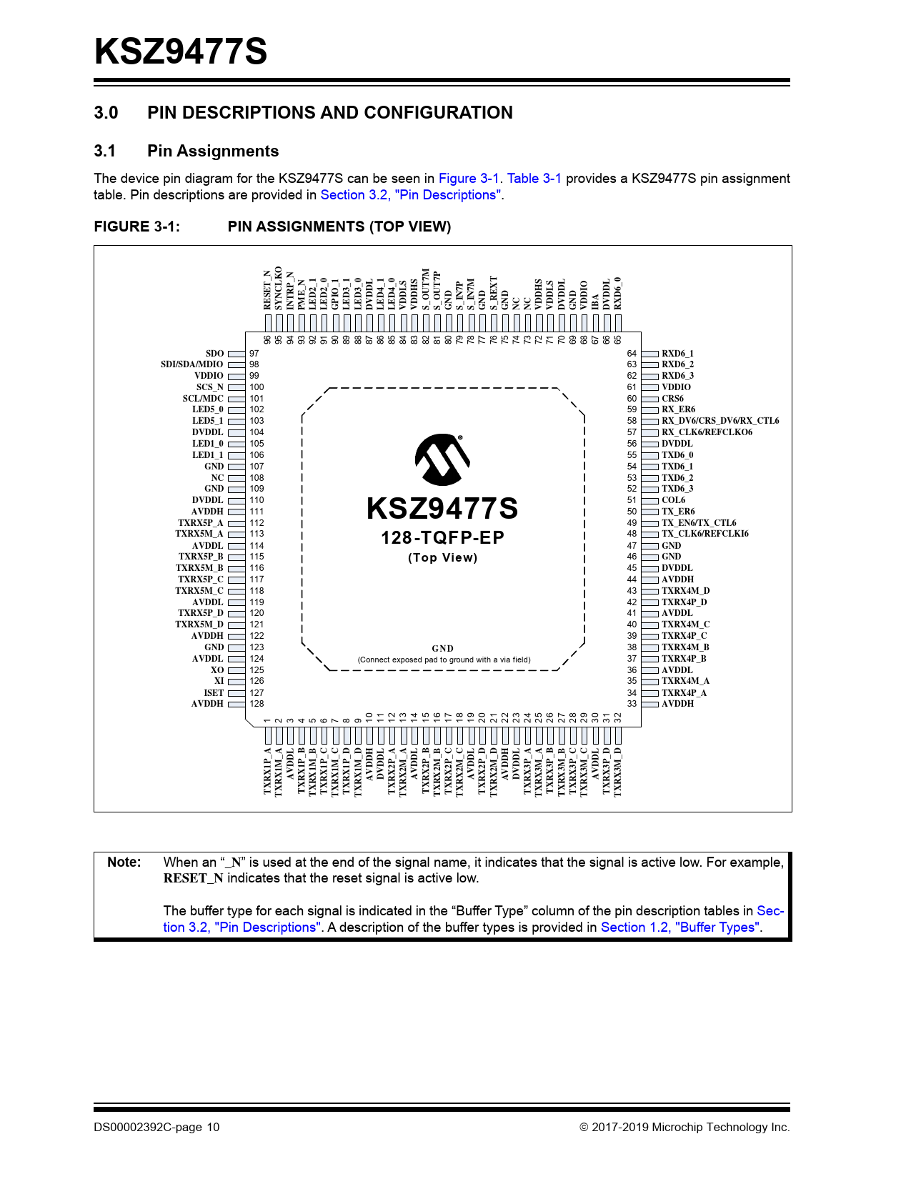 The device pin diagram for the KSZ9477S can be seen in Figure 3-1. Table 3-1 provides a KSZ9477S pin assignment table. Pin descriptions are provided in Section 3.2, "Pin Descriptions".