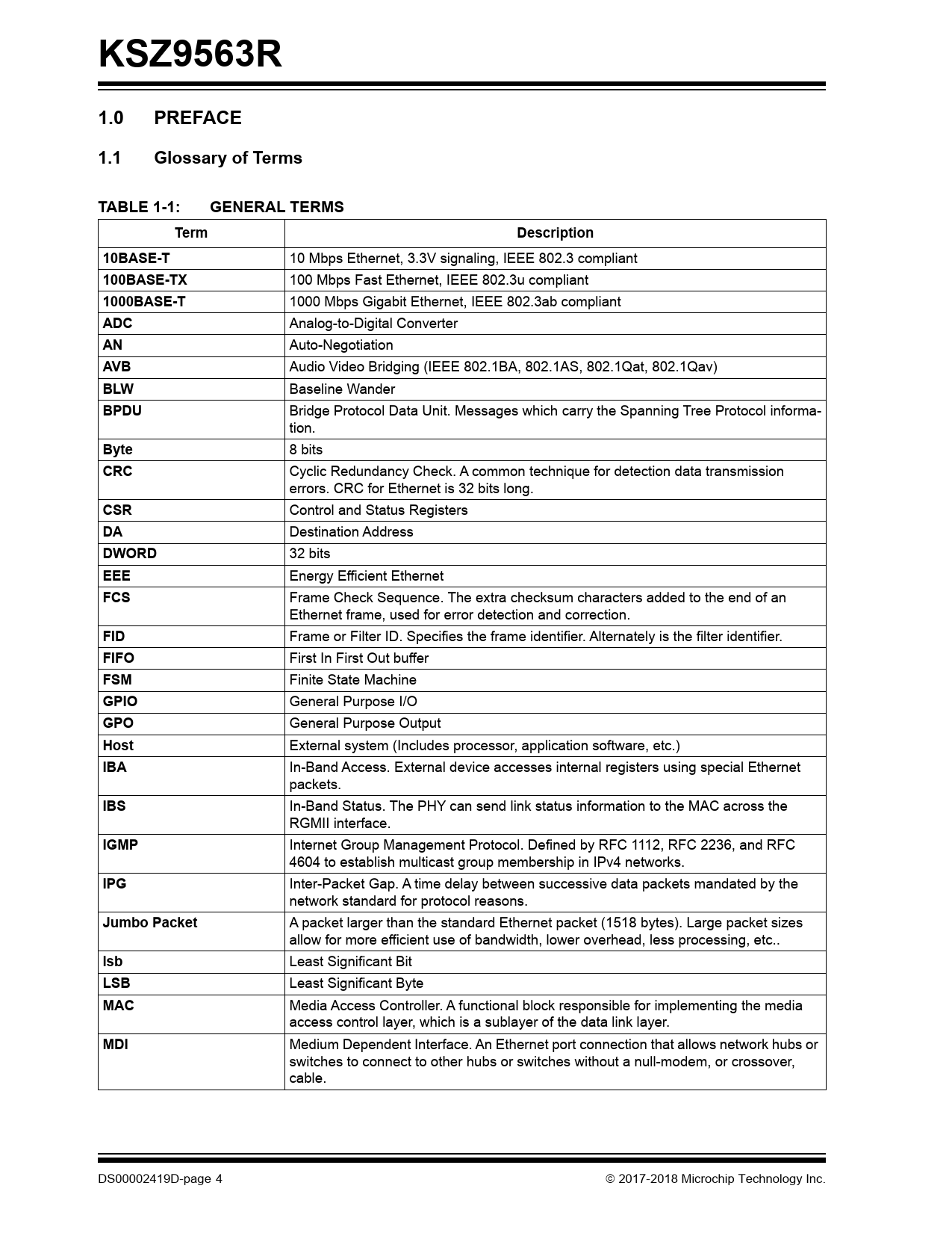 KSZ9563R. 1.0. PREFACE. 1.1. Glossary of Terms. TABLE 1-1:. GENERAL TERMS. Term. Description. 10BASE-T. 100BASE-TX. 1000BASE-T. ADC. AVB. BLW. BPDU
