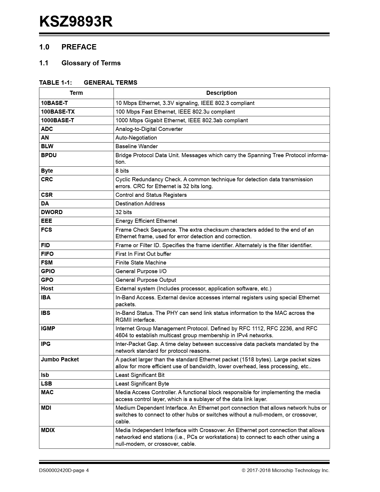 KSZ9893R1.0PREFACE1.1Glossary of TermsTABLE 1-1:GENERAL TERMSTermDescription10BASE-T 10 Mbps Ethernet, 3.3V signaling, IEEE 802.3 compliant 100BASE-TX 100 Mbps Fast Ethernet, IEEE 802.3u compliant 1000BASE-T 1000 Mbps Gigabit Ethernet, IEEE 802.3ab compliant ADC Analog-to-Digital Converter AN Auto-Negotiation BLW Baseline Wander BPDU Bridge Protocol Data Unit. Messages which carry the Spanning Tree Protocol informa- tion. Byte 8 bits CRC Cyclic Redundancy Check. A common technique for detection data transmission errors. CRC for Ethernet is 32 bits long. CSR Control and Status Registers DA Destination Address DWORD 32 bits EEE Energy Efficient Ethernet FCS Frame Check Sequence. The extra checksum characters added to the end of an Ethernet frame, used for error detection and correction. FID Frame or Filter ID. Specifies the frame identifier. Alternately is the filter identifier. FIFO First In First Out buffer FSM Finite State Machine GPIO General Purpose I/O GPO General Purpose Output Host External system (Includes processor, application software, etc.) IBA In-Band Access. External device accesses internal registers using special Ethernet packets. IBS In-Band Status. The PHY can send link status information to the MAC across the RGMII interface. IGMP Internet Group Management Protocol. Defined by RFC 1112, RFC 2236, and RFC 4604 to establish multicast group membership in IPv4 networks. IPG Inter-Packet Gap. A time delay between successive data packets mandated by the network standard for protocol reasons. Jumbo Packet A packet larger than the standard Ethernet packet (1518 bytes). Large packet sizes allow for more efficient use of bandwidth, lower overhead, less processing, etc.. lsb Least Significant Bit LSB Least Significant Byte MAC Media Access Controller. A functional block responsible for implementing the media access control layer, which is a sublayer of the data link layer. MDI Medium Dependent Interface. An Ethernet port connection that allows network hubs or switches to connect to other hubs or switches without a nul -modem, or crossover, cable. MDIX Media Independent Interface with Crossover. An Ethernet port connection that allows networked end stations (i.e., PCs or workstations) to connect to each other using a null-modem, or crossover, cable. DS00002420D-page 4 2017-2018 Microchip Technology Inc. Document Outline 1.0 Preface 1.1 Glossary of Terms TABLE 1-1: General Terms 1.2 Buffer Types TABLE 1-2: Buffer Types 1.3 Register Nomenclature TABLE 1-3: Register Nomenclature 1.4 References 2.0 Introduction 2.1 General Description FIGURE 2-1: Internal Block Diagram 3.0 Pin Descriptions and Configuration 3.1 Pin Assignments FIGURE 3-1: Pin Assignments (Top View) TABLE 3-1: Pin Assignments 3.2 Pin Descriptions TABLE 3-2: Pin Descriptions 3.2.1 Configuration Straps TABLE 3-3: Configuration Strap Descriptions 4.0 Functional Description 4.1 Physical Layer Transceiver (PHY) 4.1.1 1000BASE-T Transceiver 4.1.2 100BASE-TX Transceiver 4.1.3 10BASE-T/Te Transceiver 4.1.4 Auto MDI/MDI-X TABLE 4-1: MDI/MDI-X Pin Definitions 4.1.5 Pair-Swap, Alignment, and Polarity Check 4.1.6 Wave Shaping, Slew-Rate Control, and Partial Response 4.1.7 Auto-Negotiation FIGURE 4-1: Auto-Negotiation and Parallel Operation 4.1.8 LinkMD® Cable Diagnostics 4.1.9 Remote PHY Loopback FIGURE 4-2: Remote PHY Loopback 4.2 LEDs 4.2.1 Single-LED Mode TABLE 4-2: Single-LED Mode Pin Definition 4.2.2 Tri-Color Dual-LED Mode TABLE 4-3: Tri-Color Dual-LED Mode Pin Definition 4.3 Media Access Controller (MAC) 4.3.1 MAC Operation 4.3.2 Inter-Packet Gap (IPG) 4.3.3 Back-Off Algorithm 4.3.4 Late Collision 4.3.5 Legal Packet Size 4.3.6 Flow Control 4.3.7 Half-Duplex Back Pressure 4.3.8 Flow Control and Back Pressure Registers TABLE 4-4: Flow Control and back Pressure Registers 4.3.9 Broadcast Storm Protection 4.3.10 Self-Address Filtering 4.4 Switch 4.4.1 Switching Engine 4.4.2 Address Lookup TABLE 4-5: Address Lookup Table Hashing Options TABLE 4-6: Reserved Multicast Address Table FIGURE 4-3: Packet Forwarding Process Flowchart TABLE 4-7: Lookup Engine Registers 4.4.3 IEEE 802.1Q VLAN TABLE 4-8: VLAN Forwarding TABLE 4-9: Hashed(DA) + FID Lookup in VLAN Mode TABLE 4-10: Hashed(SA) + FID Lookup in VLAN Mode TABLE 4-11: VLAN Registers 4.4.4 Quality-of-Service (QoS) Priority Support FIGURE 4-4: 802.p Priority Field Format 4.4.5 Traffic Conditioning & Policing 4.4.6 Spanning Tree Support TABLE 4-12: Spanning Tree States 4.4.7 Rapid Spanning Tree Support 4.4.8 Multiple Spanning Tree Support 4.4.9 Tail Tagging Mode FIGURE 4-5: Tail Tag Frame Format TABLE 4-13: Received Tail Tag Format (From Switch to Host) TABLE 4-14: Transmit Tail Tag Format (From Host to Switch) 4.4.10 IGMP Support 4.4.11 IPv6 MLD Snooping 4.4.12 Port Mirroring 4.4.13 Schedule and Rate Limiting 4.4.14 Ingress MAC Address Filtering Function 4.4.15 802.1X Port-Based Access Control 4.4.16 Access Control List (ACL) Filtering TABLE 4-15: ACL Processing Entry Parameters FIGURE 4-6: ACL Structure and Example Rule Values TABLE 4-16: Matching Rule Options TABLE 4-17: ACL Matching Rule Parameters for MD = 01 TABLE 4-18: ACL Matching Rule Parameters for MD = 10 TABLE 4-19: ACL Matching Rule Parameters for MD = 11 TABLE 4-20: ACL Action Rule Parameters for Non-count Modes (MD ≠ 01 or ENB ≠ 00) TABLE 4-21: ACL Action Rule Parameters for count Mode (MD = 01 or ENB = 00) FIGURE 4-7: ACL Table Format TABLE 4-22: ACL Registers 4.5 Clocking 4.5.1 Primary Clock 4.5.2 MAC Interface Clocks 4.5.3 Serial Management Interface Clock 4.6 Power 4.7 Power Management TABLE 4-23: MDI/MDI-X Pin Definitions 4.7.1 Normal Operation Mode 4.7.2 Energy-Detect Mode 4.7.3 Global Soft Power-Down Mode 4.7.4 Port-Based Power Down 4.7.5 Energy Efficient Ethernet (EEE) FIGURE 4-8: Traffic Activity and EEE 4.7.6 Wake on LAN (WoL) 4.8 Management Interface 4.8.1 SPI Slave Serial Bus TABLE 4-24: Register Access using the SPI Interface FIGURE 4-9: SPI Register Read Operation FIGURE 4-10: SPI Register Write Opera