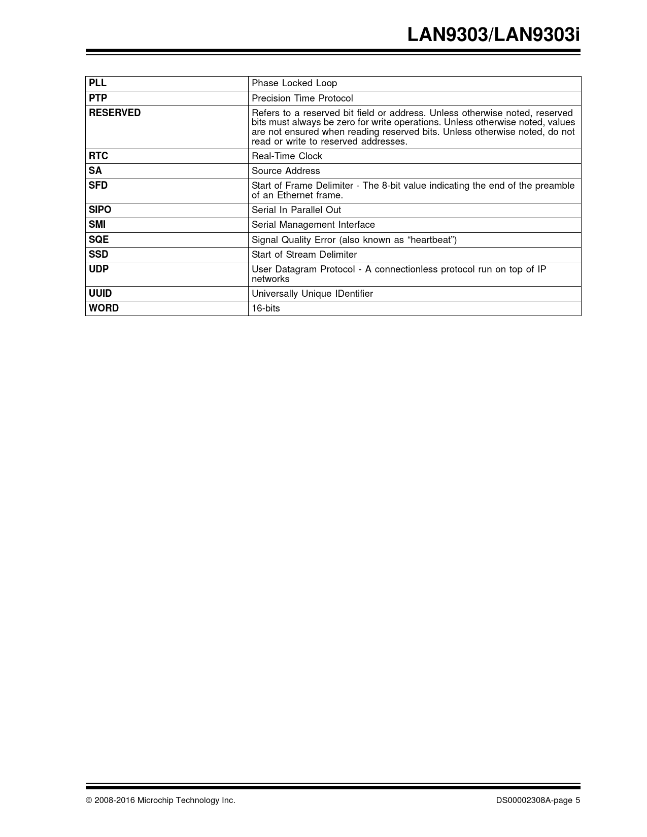 | Seiten / Seite | 264 / 5 — LAN9303/LAN9303i. PLL. PTP. RESERVED. RTC. SFD. SIPO. SMI. SQE. SSD. UDP. … |