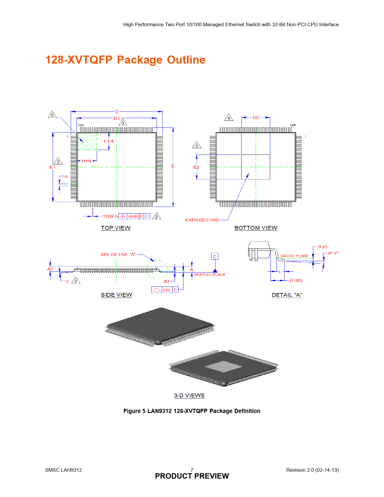 High Performance Two Port 10/100 Managed Ethernet Switch with 32-Bit Non-PCI CPU Interface 128-XVTQFP Package Outline Figure 5 LAN9312 128-XVTQFP Package Definition SMSC LAN9312 7 PRODUCT PREVIEW Revision 2.0 (02-14-13)
