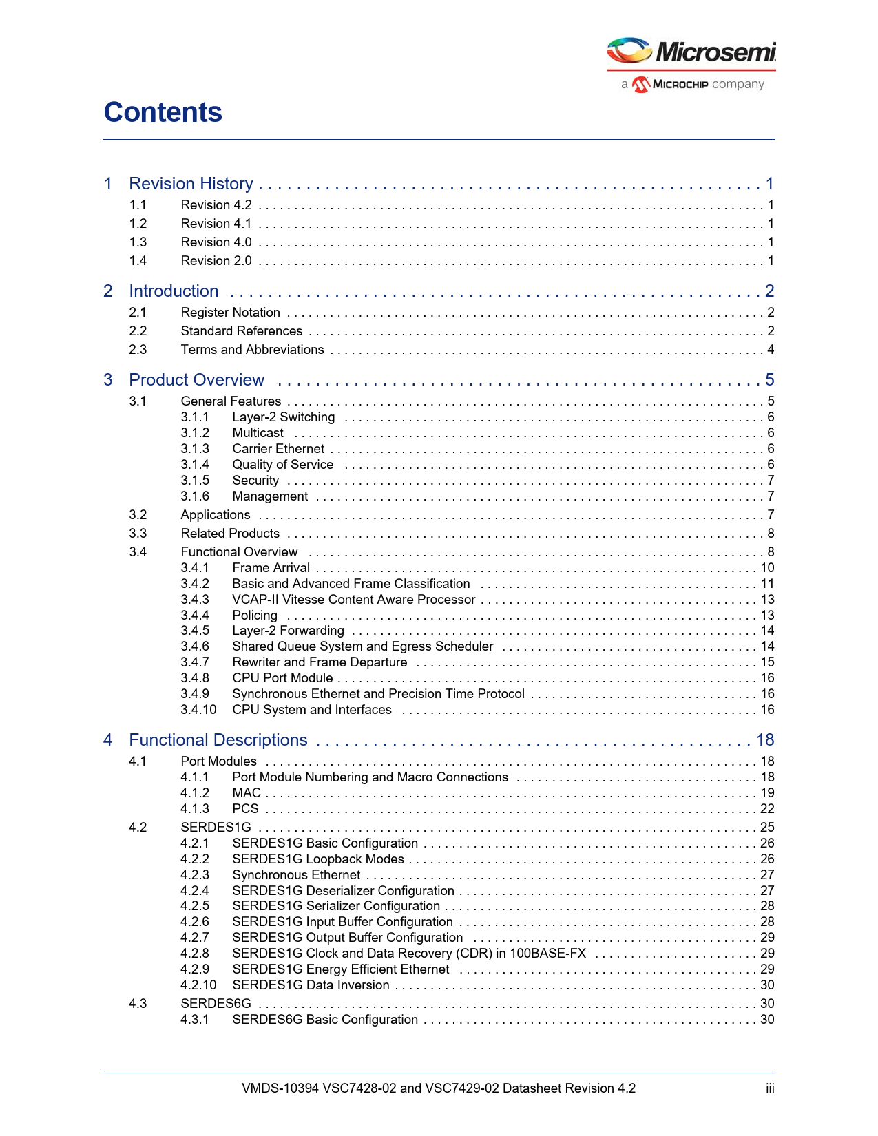 1 Revision History . 1 1.1 Revision 4.2 . 1 1.2 Revision 4.1 . 1 1.3 Revision 4.0 . 1 1.4 Revision 2.0 . 1 2 Introduction . 2 2.1 Register Notation . 2 2.2 Standard References . 2 2.3 Terms and Abbreviations . 4 3 Product Overview . 5 3.1 General Features . 5 3.1.1 Layer-2 Switching . 6 3.1.2 Multicast . 6 3.1.3 Carrier Ethernet . 6 3.1.4 Quality of Service . 6 3.1.5 Security . 7 3.1.6 Management . 7 3.2 Applications . 7 3.3 Related Products . 8 3.4 Functional Overview . 8 3.4.1 Frame Arrival . 10 3.4.2 Basic and Advanced Frame Classification . 11 3.4.3 VCAP-II Vitesse Content Aware Processor . 13 3.4.4 Policing . 13 3.4.5 Layer-2 Forwarding . 14 3.4.6 Shared Queue System and Egress Scheduler . 14 3.4.7 Rewriter and Frame Departure . 15 3.4.8 CPU Port Module . 16 3.4.9 Synchronous Ethernet and Precision Time Protocol . 16 3.4.10 CPU System and Interfaces . 16 4 Functional Descriptions . 18 4.1 Port Modules . 18 4.1.1 Port Module Numbering and Macro Connections . 18 4.1.2 MAC . 19 4.1.3 PCS . 22 4.2 SERDES1G . 25 4.2.1 SERDES1G Basic Configuration . 26 4.2.2 SERDES1G Loopback Modes . 26 4.2.3 Synchronous Ethernet . 27 4.2.4 SERDES1G Deserializer Configuration . 27 4.2.5 SERDES1G Serializer Configuration . 28 4.2.6 SERDES1G Input Buffer Configuration . 28 4.2.7 SERDES1G Output Buffer Configuration . 29 4.2.8 SERDES1G Clock and Data Recovery (CDR) in 100BASE-FX . 29 4.2.9 SERDES1G Energy Efficient Ethernet . 29 4.2.10 SERDES1G Data Inversion . 30 4.3 SERDES6G . 30 4.3.1 SERDES6G Basic Configuration . 30 VMDS-10394 VSC7428-02 and VSC7429-02 Datasheet Revision 4.2 iii Document Outline 1 Revision History 1.1 Revision 4.2 1.2 Revision 4.1 1.3 Revision 4.0 1.4 Revision 2.0 2 Introduction 2.1 Register Notation 2.2 Standard References 2.3 Terms and Abbreviations 3 Product Overview 3.1 General Features 3.1.1 Layer-2 Switching 3.1.2 Multicast 3.1.3 Carrier Ethernet 3.1.4 Quality of Service 3.1.5 Security 3.1.6 Management 3.2 Applications 3.3 Related Products 3.4 Functional Overview 3.4.1 Frame Arrival 3.4.2 Basic and Advanced Frame Classification 3.4.3 VCAP-II Vitesse Content Aware Processor 3.4.4 Policing 3.4.5 Layer-2 Forwarding 3.4.6 Shared Queue System and Egress Scheduler 3.4.7 Rewriter and Frame Departure 3.4.8 CPU Port Module 3.4.9 Synchronous Ethernet and Precision Time Protocol 3.4.10 CPU System and Interfaces 4 Functional Descriptions 4.1 Port Modules 4.1.1 Port Module Numbering and Macro Connections 4.1.2 MAC 4.1.3 PCS 4.2 SERDES1G 4.2.1 SERDES1G Basic Configuration 4.2.2 SERDES1G Loopback Modes 4.2.3 Synchronous Ethernet 4.2.4 SERDES1G Deserializer Configuration 4.2.5 SERDES1G Serializer Configuration 4.2.6 SERDES1G Input Buffer Configuration 4.2.7 SERDES1G Output Buffer Configuration 4.2.8 SERDES1G Clock and Data Recovery (CDR) in 100BASE-FX 4.2.9 SERDES1G Energy Efficient Ethernet 4.2.10 SERDES1G Data Inversion 4.3 SERDES6G 4.3.1 SERDES6G Basic Configuration 4.3.2 SERDES6G Loopback Modes 4.3.3 Synchronous Ethernet 4.3.4 SERDES6G Deserializer Configuration 4.3.5 SERDES6G Serializer Configuration 4.3.6 SERDES6G Input Buffer Configuration 4.3.7 SERDES6G Output Buffer Configuration 4.3.8 SERDES6G Clock and Data Recovery (CDR) in 100BASE-FX 4.3.9 SERDES6G Energy Efficient Ethernet 4.3.10 SERDES6G Data Inversion 4.3.11 SERDES6G Signal Detection Enhancements 4.3.12 SERDES6G High-Speed I/O Configuration Bus 4.4 Copper Transceivers 4.4.1 Register Access 4.4.2 Cat5 Twisted Pair Media Interface 4.4.3 LED Interface 4.4.4 Ethernet Inline Powered Devices 4.4.5 IEEE 802.3af PoE Support 4.4.6 ActiPHY™ Power Management 4.4.7 Testing Features 4.4.8 VeriPHY™ Cable Diagnostics 4.5 Statistics 4.6 Classifier 4.6.1 General Data Extraction Setup 4.6.2 Frame Acceptance Filtering 4.6.3 QoS, DP, and DSCP Classification 4.6.4 VLAN Classification 4.6.5 Link Aggregation Code Generation 4.6.6 CPU Forwarding Determination 4.7 VCAP-II 4.7.1 Port Configuration 4.7.2 VCAP IS1 4.7.3 VCAP IS2 4.7.4 VCAP ES0 4.7.5 Range Checkers 4.7.6 VCAP-II Configuration 4.7.7 Advanced VCAP Operations 4.8 Analyzer 4.8.1 MAC Table 4.8.2 VLAN Table 4.8.3 Forwarding Engine 4.8.4 Analyzer Monitoring 4.9 Policers and Ingress Shapers 4.9.1 Policers 4.9.2 Ingress Shapers 4.10 Shared Queue System 4.10.1 Buffer Management 4.10.2 Frame Reference Management 4.10.3 Resource Depletion Condition 4.10.4 Configuration Example 4.10.5 Watermark Programming and Consumption Monitoring 4.10.6 Advanced Resource Management 4.10.7 Ingress Pause Request Generation 4.10.8 Tail Dropping 4.10.9 Test Utilities 4.10.10 Energy Efficient Ethernet 4.11 Scheduler and Shaper 4.11.1 Egress Shapers 4.11.2 Deficit Weighted Round Robin 4.11.3 Shaping and DWRR Scheduling Examples 4.12 Rewriter 4.12.1 VLAN Editing 4.12.2 DSCP Remarking 4.12.3 FCS Updating 4.12.4 CPU Extraction Header Insertion 4.13 CPU Port Module 4.13.1 Frame Extraction 4.13.2 Frame Injection 4.13.3 Network Processor Interface (NPI) 4.14 Layer-1 Timing 4.15 Hardware Timestamping 4.15.1 Timestamp Classification 4.15.2 One-Second Timer 4.15.3 Delay Timer 4.15.4 Time of Day Counter 4.16 Clocking and Reset 5 VCore-III System and CPU Interface 5.1 VCore-III Configurations 5.2 Clocking and Reset 5.2.1 Watchdog Timer 5.3 Shared Bus 5.3.1 Shared Bus Arbitration 5.3.2 SI Memory Region 5.3.3 PI Memory Region 5.3.4 DDR2 Memory Region 5.3.5 Switch Core Registers Memory Region 5.3.6 VCore-III Registers Memory Region 5.4 VCore-III CPU 5.4.1 Big Endian Support 5.4.2 Software Debug and Development 5.5 Manual Frame Injection and Extraction 5.5.1 Manual Frame Extraction 5.5.2 Manual Frame Injection 5.5.3 Frame Interrupts 5.6 Frame DMA 5.6.1 DMA Control Block Structures 5.6.2 Extraction 5.6.3 Injection 5.6.4 Frame DMA Interrupt 5.7 External CPU Support 5.7.1 Register Access and Multimaster Systems 5.7.2 Serial Interface in Slave Mode 5.7.3 Parallel Interface in Slave Mode 5.7.4 MIIM Interface in Slave Mode 5.7.5 Access to the VCore-III Shared Bus 5.7.6 Mailbox and Semaphores 5.8 VCore-III System Peripherals 5.8.1 Timers 5.8.