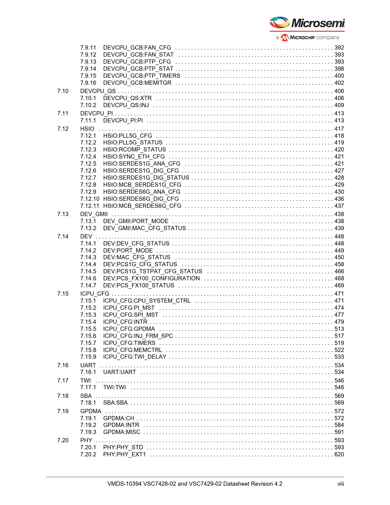 Modelllinie für dieses Datenblatt Textversion des Dokuments link to page 421 link to page 422 link to page 422 link to page 427 link to page 429 link to page 431 link to page 435 link to page 435 link to page 438 link to page 442 link to page 442 link to page 446 link to page 447 link to page 448 link to page 449 link to page 450 link to page 450 link to page 456 link to page 457 link to page 458 link to page 459 link to page 465 link to page 466 link to page 467 link to page 467 link to page 468 link to page 477 link to page 477 link to page 478 link to page 479 link to page 487 link to page 495 link to page 497 link to page 498 link to page 500 link to page 500 link to page 503 link to page 506 link to page 508 link to page 542 link to page 546 link to page 548 link to page 551 link to page 562 link to page 563 link to page 563 link to page 575 link to page 575 link to page 598 link to page 598 link to page 601 link to page 601 link to page 613 link to page 620 link to page 622 link to page 622 link to page 649 7.9.11 DEVCPU_GCB:FAN_CFG . 392 7.9.12 DEVCPU_GCB:FAN_STAT . 393 7.9.13 DEVCPU_GCB:PTP_CFG . 393 7.9.14 DEVCPU_GCB:PTP_STAT . 398 7.9.15 DEVCPU_GCB:PTP_TIMERS . 400 7.9.16 DEVCPU_GCB:MEMITGR . 402 7.10 DEVCPU_QS . 406 7.10.1 DEVCPU_QS:XTR . 406 7.10.2 DEVCPU_QS:INJ . 409 7.11 DEVCPU_PI . 413 7.11.1 DEVCPU_PI:PI . 413 7.12 HSIO . 417 7.12.1 HSIO:PLL5G_CFG . 418 7.12.2 HSIO:PLL5G_STATUS . 419 7.12.3 HSIO:RCOMP_STATUS . 420 7.12.4 HSIO:SYNC_ETH_CFG . 421 7.12.5 HSIO:SERDES1G_ANA_CFG . 421 7.12.6 HSIO:SERDES1G_DIG_CFG . 427 7.12.7 HSIO:SERDES1G_DIG_STATUS . 428 7.12.8 HSIO:MCB_SERDES1G_CFG . 429 7.12.9 HSIO:SERDES6G_ANA_CFG . 430 7.12.10 HSIO:SERDES6G_DIG_CFG . 436 7.12.11 HSIO:MCB_SERDES6G_CFG . 437 7.13 DEV_GMII . 438 7.13.1 DEV_GMII:PORT_MODE . 438 7.13.2 DEV_GMII:MAC_CFG_STATUS . 439 7.14 DEV . 448 7.14.1 DEV:DEV_CFG_STATUS . 448 7.14.2 DEV:PORT_MODE . 449 7.14.3 DEV:MAC_CFG_STATUS . 450 7.14.4 DEV:PCS1G_CFG_STATUS . 458 7.14.5 DEV:PCS1G_TSTPAT_CFG_STATUS . 466 7.14.6 DEV:PCS_FX100_CONFIGURATION . 468 7.14.7 DEV:PCS_FX100_STATUS . 469 7.15 ICPU_CFG . 471 7.15.1 ICPU_CFG:CPU_SYSTEM_CTRL . 471 7.15.2 ICPU_CFG:PI_MST . 474 7.15.3 ICPU_CFG:SPI_MST . 477 7.15.4 ICPU_CFG:INTR . 479 7.15.5 ICPU_CFG:GPDMA . 513 7.15.6 ICPU_CFG:INJ_FRM_SPC . 517 7.15.7 ICPU_CFG:TIMERS . 519 7.15.8 ICPU_CFG:MEMCTRL . 522 7.15.9 ICPU_CFG:TWI_DELAY . 533 7.16 UART . 534 7.16.1 UART:UART . 534 7.17 TWI . 546 7.17.1 TWI:TWI . 546 7.18 SBA . 569 7.18.1 SBA:SBA . 569 7.19 GPDMA . 572 7.19.1 GPDMA:CH . 572 7.19.2 GPDMA:INTR . 584 7.19.3 GPDMA:MISC . 591 7.20 PHY . 593 7.20.1 PHY:PHY_STD . 593 7.20.2 PHY:PHY_EXT1 . 620 VMDS-10394 VSC7428-02 and VSC7429-02 Datasheet Revision 4.2 vii Document Outline 1 Revision History 1.1 Revision 4.2 1.2 Revision 4.1 1.3 Revision 4.0 1.4 Revision 2.0 2 Introduction 2.1 Register Notation 2.2 Standard References 2.3 Terms and Abbreviations 3 Product Overview 3.1 General Features 3.1.1 Layer-2 Switching 3.1.2 Multicast 3.1.3 Carrier Ethernet 3.1.4 Quality of Service 3.1.5 Security 3.1.6 Management 3.2 Applications 3.3 Related Products 3.4 Functional Overview 3.4.1 Frame Arrival 3.4.2 Basic and Advanced Frame Classification 3.4.3 VCAP-II Vitesse Content Aware Processor 3.4.4 Policing 3.4.5 Layer-2 Forwarding 3.4.6 Shared Queue System and Egress Scheduler 3.4.7 Rewriter and Frame Departure 3.4.8 CPU Port Module 3.4.9 Synchronous Ethernet and Precision Time Protocol 3.4.10 CPU System and Interfaces 4 Functional Descriptions 4.1 Port Modules 4.1.1 Port Module Numbering and Macro Connections 4.1.2 MAC 4.1.3 PCS 4.2 SERDES1G 4.2.1 SERDES1G Basic Configuration 4.2.2 SERDES1G Loopback Modes 4.2.3 Synchronous Ethernet 4.2.4 SERDES1G Deserializer Configuration 4.2.5 SERDES1G Serializer Configuration 4.2.6 SERDES1G Input Buffer Configuration 4.2.7 SERDES1G Output Buffer Configuration 4.2.8 SERDES1G Clock and Data Recovery (CDR) in 100BASE-FX 4.2.9 SERDES1G Energy Efficient Ethernet 4.2.10 SERDES1G Data Inversion 4.3 SERDES6G 4.3.1 SERDES6G Basic Configuration 4.3.2 SERDES6G Loopback Modes 4.3.3 Synchronous Ethernet 4.3.4 SERDES6G Deserializer Configuration 4.3.5 SERDES6G Serializer Configuration 4.3.6 SERDES6G Input Buffer Configuration 4.3.7 SERDES6G Output Buffer Configuration 4.3.8 SERDES6G Clock and Data Recovery (CDR) in 100BASE-FX 4.3.9 SERDES6G Energy Efficient Ethernet 4.3.10 SERDES6G Data Inversion 4.3.11 SERDES6G Signal Detection Enhancements 4.3.12 SERDES6G High-Speed I/O Configuration Bus 4.4 Copper Transceivers 4.4.1 Register Access 4.4.2 Cat5 Twisted Pair Media Interface 4.4.3 LED Interface 4.4.4 Ethernet Inline Powered Devices 4.4.5 IEEE 802.3af PoE Support 4.4.6 ActiPHY™ Power Management 4.4.7 Testing Features 4.4.8 VeriPHY™ Cable Diagnostics 4.5 Statistics 4.6 Classifier 4.6.1 General Data Extraction Setup 4.6.2 Frame Acceptance Filtering 4.6.3 QoS, DP, and DSCP Classification 4.6.4 VLAN Classification 4.6.5 Link Aggregation Code Generation 4.6.6 CPU Forwarding Determination 4.7 VCAP-II 4.7.1 Port Configuration 4.7.2 VCAP IS1 4.7.3 VCAP IS2 4.7.4 VCAP ES0 4.7.5 Range Checkers 4.7.6 VCAP-II Configuration 4.7.7 Advanced VCAP Operations 4.8 Analyzer 4.8.1 MAC Table 4.8.2 VLAN Table 4.8.3 Forwarding Engine 4.8.4 Analyzer Monitoring 4.9 Policers and Ingress Shapers 4.9.1 Policers 4.9.2 Ingress Shapers 4.10 Shared Queue System 4.10.1 Buffer Management 4.10.2 Frame Reference Management 4.10.3 Resource Depletion Condition 4.10.4 Configuration Example 4.10.5 Watermark Programming and Consumption Monitoring 4.10.6 Advanced Resource Management 4.10.7 Ingress Pause Request Generation 4.10.8 Tail Dropping 4.10.9 Test Utilities 4.10.10 Energy Efficient Ethernet 4.11 Scheduler and Shaper 4.11.1 Egress Shapers 4.11.2 Deficit Weighted Round Robin 4.11.3 Shaping and DWRR Scheduling Examples 4.12 Rewriter 4.12.1 VLAN Editing 4.12.2 DSCP Remarking 4.12.3 FCS Updating 4.12.4 CPU Extraction Header Insertion 4.13 CPU Port Module 4.13.1 Frame Extraction 4.13.2 Frame Injection 4.13.3 Network Proc