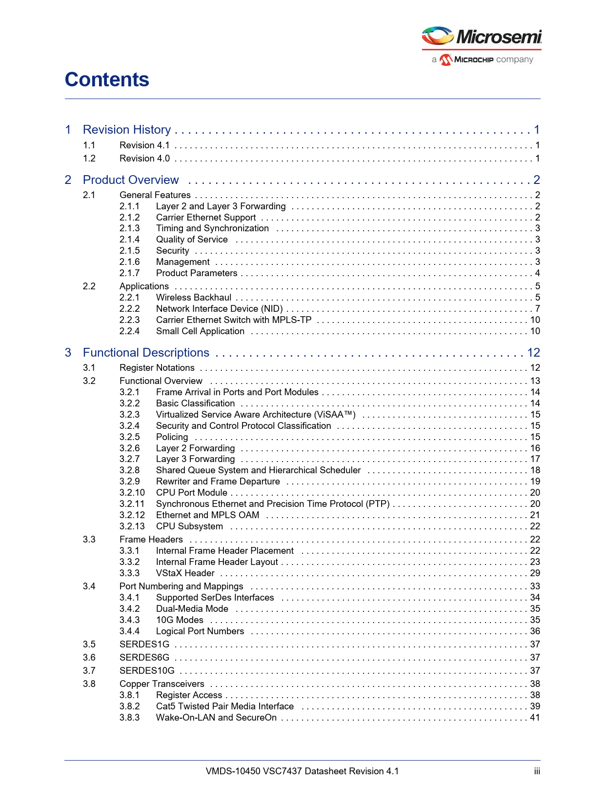 1 Revision History . 1 1.1 Revision 4.1 . 1 1.2 Revision 4.0 . 1 2 Product Overview . 2 2.1 General Features . 2 2.1.1 Layer 2 and Layer 3 Forwarding . 2 2.1.2 Carrier Ethernet Support . 2 2.1.3 Timing and Synchronization . 3 2.1.4 Quality of Service . 3 2.1.5 Security . 3 2.1.6 Management . 3 2.1.7 Product Parameters . 4 2.2 Applications . 5 2.2.1 Wireless Backhaul . 5 2.2.2 Network Interface Device (NID) . 7 2.2.3 Carrier Ethernet Switch with MPLS-TP . 10 2.2.4 Small Cell Application . 10 3 Functional Descriptions . 12 3.1 Register Notations . 12 3.2 Functional Overview . 13 3.2.1 Frame Arrival in Ports and Port Modules . 14 3.2.2 Basic Classification . 14 3.2.3 Virtualized Service Aware Architecture (ViSAA™) . 15 3.2.4 Security and Control Protocol Classification . 15 3.2.5 Policing . 15 3.2.6 Layer 2 Forwarding . 16 3.2.7 Layer 3 Forwarding . 17 3.2.8 Shared Queue System and Hierarchical Scheduler . 18 3.2.9 Rewriter and Frame Departure . 19 3.2.10 CPU Port Module . 20 3.2.11 Synchronous Ethernet and Precision Time Protocol (PTP) . 20 3.2.12 Ethernet and MPLS OAM . 21 3.2.13 CPU Subsystem . 22 3.3 Frame Headers . 22 3.3.1 Internal Frame Header Placement . 22 3.3.2 Internal Frame Header Layout . 23 3.3.3 VStaX Header . 29 3.4 Port Numbering and Mappings . 33 3.4.1 Supported SerDes Interfaces . 34 3.4.2 Dual-Media Mode . 35 3.4.3 10G Modes . 35 3.4.4 Logical Port Numbers . 36 3.5 SERDES1G . 37 3.6 SERDES6G . 37 3.7 SERDES10G . 37 3.8 Copper Transceivers . 38 3.8.1 Register Access . 38 3.8.2 Cat5 Twisted Pair Media Interface . 39 3.8.3 Wake-On-LAN and SecureOn . 41 VMDS-10450 VSC7437 Datasheet Revision 4.1 iii Document Outline 1 Revision History 1.1 Revision 4.1 1.2 Revision 4.0 2 Product Overview 2.1 General Features 2.1.1 Layer 2 and Layer 3 Forwarding 2.1.2 Carrier Ethernet Support 2.1.3 Timing and Synchronization 2.1.4 Quality of Service 2.1.5 Security 2.1.6 Management 2.1.7 Product Parameters 2.2 Applications 2.2.1 Wireless Backhaul 2.2.2 Network Interface Device (NID) 2.2.3 Carrier Ethernet Switch with MPLS-TP 2.2.4 Small Cell Application 3 Functional Descriptions 3.1 Register Notations 3.2 Functional Overview 3.2.1 Frame Arrival in Ports and Port Modules 3.2.2 Basic Classification 3.2.3 Virtualized Service Aware Architecture (ViSAA™) 3.2.4 Security and Control Protocol Classification 3.2.5 Policing 3.2.6 Layer 2 Forwarding 3.2.7 Layer 3 Forwarding 3.2.8 Shared Queue System and Hierarchical Scheduler 3.2.9 Rewriter and Frame Departure 3.2.10 CPU Port Module 3.2.11 Synchronous Ethernet and Precision Time Protocol (PTP) 3.2.12 Ethernet and MPLS OAM 3.2.13 CPU Subsystem 3.3 Frame Headers 3.3.1 Internal Frame Header Placement 3.3.2 Internal Frame Header Layout 3.3.3 VStaX Header 3.4 Port Numbering and Mappings 3.4.1 Supported SerDes Interfaces 3.4.2 Dual-Media Mode 3.4.3 10G Modes 3.4.4 Logical Port Numbers 3.5 SERDES1G 3.6 SERDES6G 3.7 SERDES10G 3.8 Copper Transceivers 3.8.1 Register Access 3.8.2 Cat5 Twisted Pair Media Interface 3.8.3 Wake-On-LAN and SecureOn 3.8.4 Ethernet Inline Powered Devices 3.8.5 IEEE 802.3af PoE Support 3.8.6 ActiPHY™ Power Management 3.8.7 Testing Features 3.8.8 VeriPHY™ Cable Diagnostics 3.9 DEV1G and DEV2G5 Port Modules 3.9.1 MAC 3.9.2 Half-Duplex Mode 3.9.3 Physical Coding Sublayer (PCS) 3.9.4 Port Statistics 3.10 DEV10G Port Module 3.10.1 MAC 3.10.2 Physical Coding Sublayer (PCS) 3.10.3 Port Statistics 3.11 Assembler 3.11.1 Setting Up a Port in the Assembler 3.11.2 Setting Up a Port for Frame Injection 3.11.3 Setting Up MAC Control Sublayer PAUSE Frame Detection 3.11.4 Setting Up PFC 3.11.5 Setting Up Assembler Port Statistics 3.11.6 Setting Up the Loopback Path 3.12 Versatile Content-Aware Processor (VCAP) 3.12.1 Configuring VCAP 3.12.2 Wide VCAP Entries and Actions 3.12.3 Individual VCAPs 3.12.4 VCAP Programming Examples 3.13 Pipeline Points 3.13.1 Pipeline Definitions 3.14 Analyzer 3.14.1 Initializing the Analyzer 3.15 VCAP CLM Keys and Actions 3.15.1 Keys Overview 3.15.2 VCAP CLM X1 Key Details 3.15.3 VCAP CLM X2 Key Details 3.15.4 VCAP CLM X4 Key Details 3.15.5 VCAP CLM X8 Key Details 3.15.6 VCAP CLM X16 Key Details 3.15.7 VCAP CLM Actions 3.16 Analyzer Classifier 3.16.1 Basic Classifier 3.16.2 VCAP CLM Processing 3.16.3 QoS Mapping Table 3.16.4 Ingress Protection Table (IPT) 3.16.5 Layer 2 Control Protocol Processing 3.16.6 Y.1731 Ethernet MIP 3.16.7 Analyzer Classifier Diagnostics 3.17 VLAN and MSTP 3.17.1 Private VLAN 3.17.2 VLAN Pseudo Code 3.18 VCAP LPM: Keys and Action 3.18.1 VCAP LPM SGL_IP4 Key Details 3.18.2 VCAP LPM DBL_IP4 Key Details 3.18.3 VCAP LPM SGL_IP6 Key Details 3.18.4 VCAP LPM DBL_IP6 Key Details 3.18.5 VCAP LPM Actions 3.19 IP Processing 3.19.1 IP Source/Destination Guard 3.19.2 IP Routing 3.19.3 Statistics 3.19.4 IGMP/MLD Snooping Switch 3.20 VCAP IS2 Keys and Actions 3.20.1 VCAP IS2 Keys 3.20.2 VCAP IS2 Actions 3.21 Analyzer Access Control Lists 3.21.1 VCAP IS2 3.21.2 Analyzer Access Control List Frame Rewriting 3.22 Analyzer Layer 2 Forwarding and Learning 3.22.1 Analyzer MAC Table 3.22.2 MAC Table Updates 3.22.3 CPU Access to MAC Table 3.22.4 SCAN Command 3.22.5 Forwarding Lookups 3.22.6 Source Check and Automated Learning 3.22.7 Automated Aging (AUTOAGE) 3.22.8 Service Handling 3.22.9 Interrupt Handling 3.23 Analyzer Access Control Forwarding, Policing, and Statistics 3.23.1 Mask Handling 3.23.2 Policing 3.23.3 Analyzer Statistics 3.23.4 Analyzer sFlow Sampling 3.23.5 Mirroring 3.24 Versatile OAM Processor (VOP) 3.24.1 VOP Blocks 3.24.2 Versatile OAM Endpoint (VOE) Functions 3.24.3 Supported OAM PDUs 3.24.4 VOE Locations 3.25 VOP Common Functions 3.25.1 Accessing the VOP 3.25.2 VOE Hierarchy 3.25.3 VOE Frame Injection and Extraction 3.25.4 Loss Measurement (LM) Counters 3.25.5 Port Count-All Rx/Tx Counters 3.25.6 Basic VOP Configuration 3.25.7 Loss of Continuity Controller 3.25.8 Hit-Me-Once Controller 3.25.9 Interrupt Controller 3.25.10 Ethernet Configuration 3.25.11 MPLS-TP Configuration 3.26 VOE: Ethernet OAM 3.2