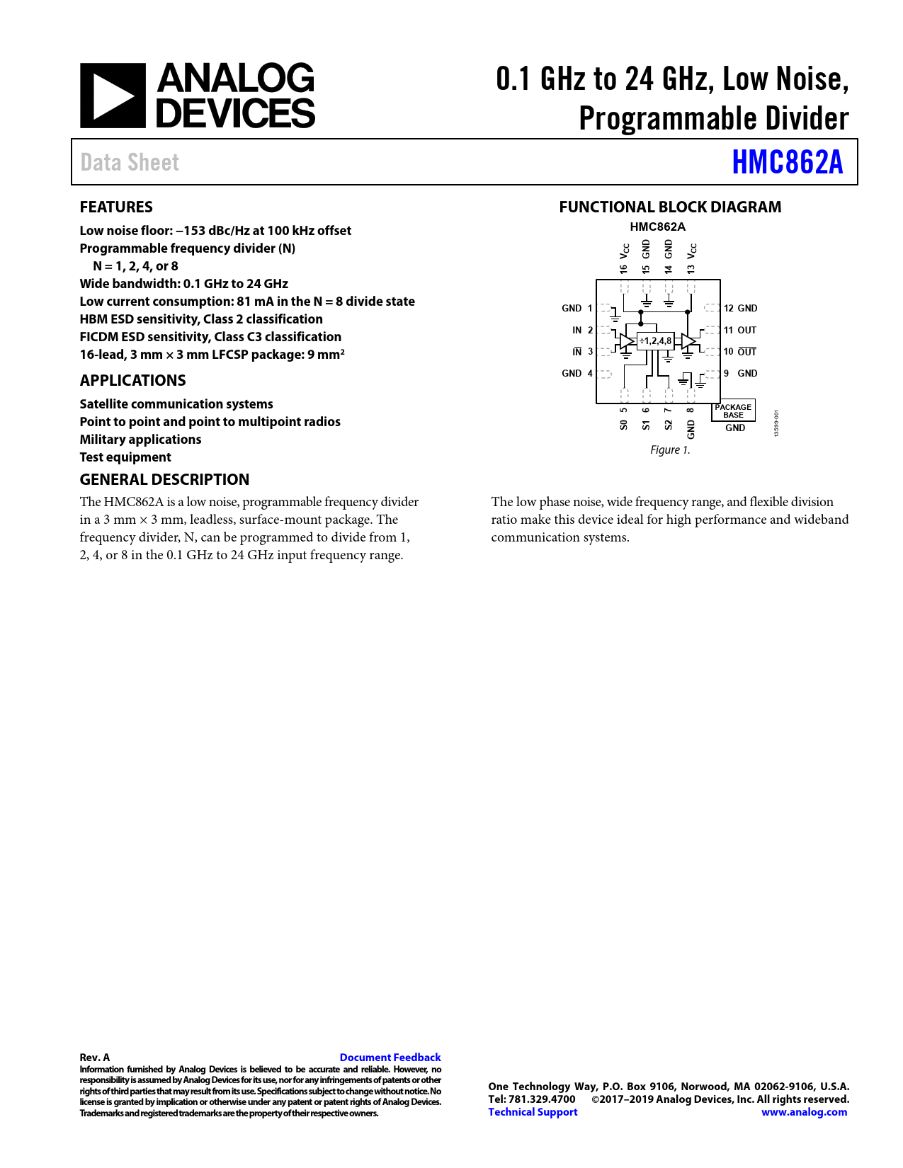 The HMC862A is a low noise, programmable frequency divider The low phase noise, wide frequency range, and flexible division in a 3 mm × 3 mm, leadless, surface-mount package. The ratio make this device ideal for high performance and wideband frequency divider, N, can be programmed to divide from 1, communication systems. 2, 4, or 8 in the 0.1 GHz to 24 GHz input frequency range.