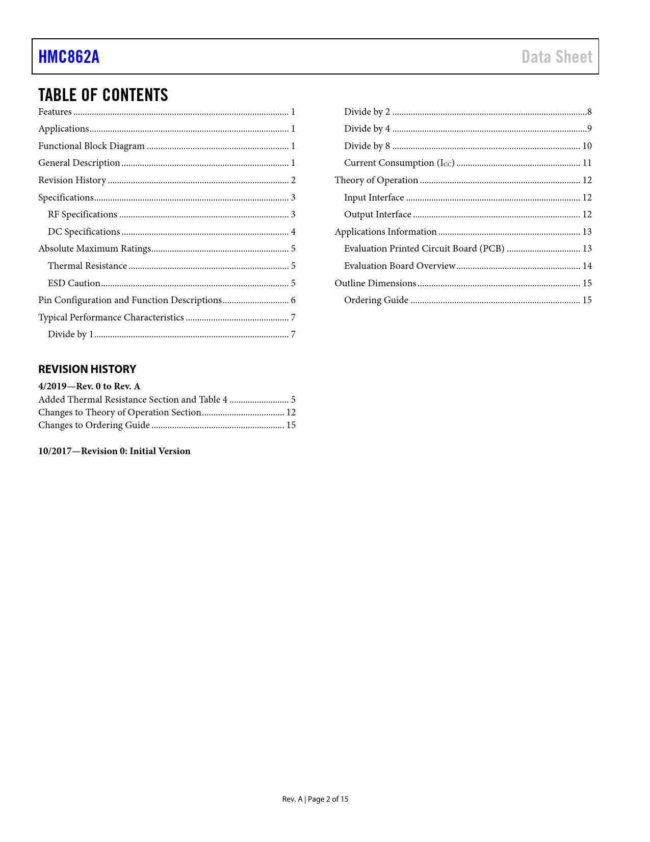 Seiten / Seite15 / 2 — HMC862A. Data Sheet. TABLE OF CONTENTS. REVISION HISTORY. 4/2019—Rev. 0 …