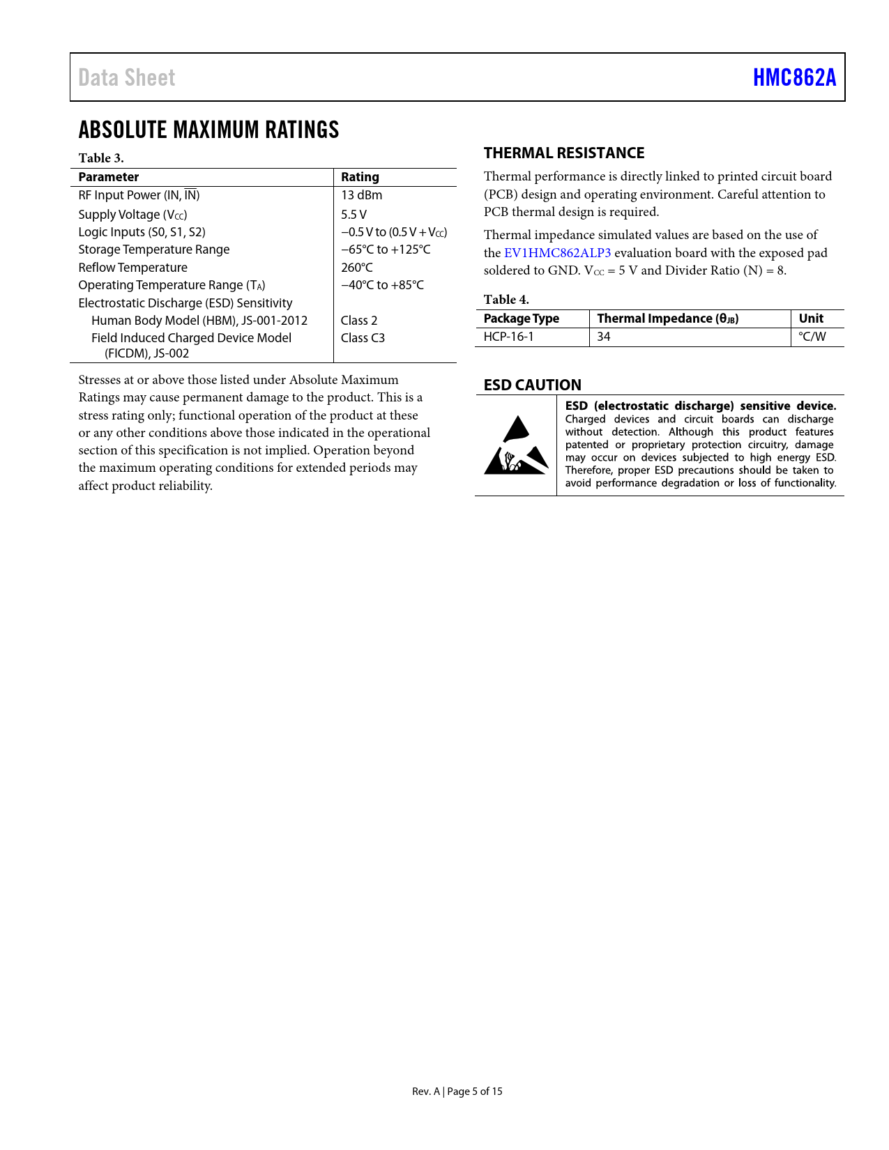 Seiten / Seite15 / 5 — Data Sheet. HMC862A. ABSOLUTE MAXIMUM RATINGS Table 3. THERMAL …