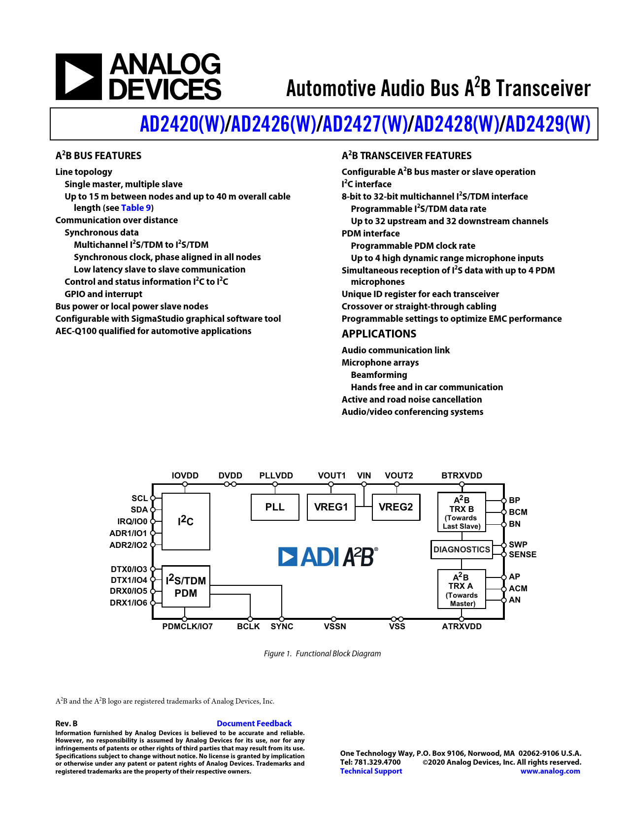 Automotive Audio Bus A2B Transceiver. AD2420(W). /AD2426(W). /AD2427(W). /AD2428(W). AD2429(W). A2B BUS FEATURES