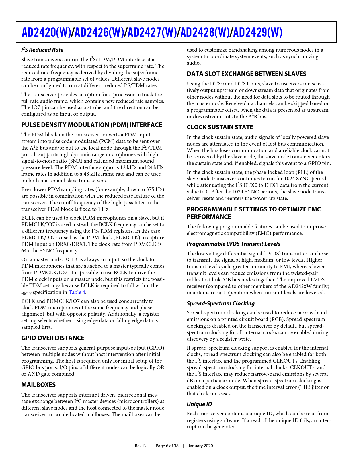 different slave nodes and the host connected to the master node transceiver in two dedicated mailboxes. The mailboxes can be Each transceiver contains a unique ID, which can be read from registers using software. If a read of the unique ID fails, an inter- rupt can be generated. Rev. B | Page 6 of 38 | January 2020 Document Outline Automotive Audio Bus A2B Transceiver A2B Bus Features A2B Transceiver Features Applications Table of Contents Revision History General Description A2B Bus Details I2C Interface I2S/TDM Interface I2S Reduced Rate Pulse Density Modulation (PDM) Interface GPIO Over Distance Mailboxes Data Slot Exchange Between Slaves Clock Sustain State Programmable Settings to Optimize EMC Performance Programmable LVDS Transmit Levels Spread-Spectrum Clocking Unique ID Support for Crossover or Straight Through Cabling Data Only and Power Only Bus Operation Specifications Operating Conditions Electrical Characteristics Power Supply Rejection Ratio (PSRR) Timing Specifications Power-Up Sequencing Restrictions A2B Bus System Specification RMS Time Interval Error (TIE) Jitter PDM Typical Performance Characteristics Absolute Maximum Ratings Thermal Characteristics ESD Caution Test Circuits and Switching Characteristics Output Drive Currents Test Conditions Output Enable Time Measurement Output Disable Time Measurement Capacitive Loading Pin Configuration and Function Descriptions Power Analysis Current Flow Constant Current PLL Supply Current VIN Quiescent Current IOVDD Current Peripheral Supply Current Digital Logic Supply Current A2B Bus TX/RX Current LVDS Transmitter and Receiver Supply Currents Downstream/Upstream Activity Level LVDS Transmitter and Receiver Idle Current VREG1 and VREG2 Output Currents Current at VIN (IVIN) Power Dissipation Resistance Between Nodes Voltage Regulator Current in Master Node or Local Powered Slave Node Power Dissipation of A2B Bus Power Analysis of Bus Powered System Supply Voltage Reducing Power Consumption Power-Down Mode Standby Mode Control Mode Thermal Power Designer Reference VSENSE and Considerations for Diodes Optional Add On Circuits Layout Guidelines Outline Dimensions Automotive Products Ordering Guide