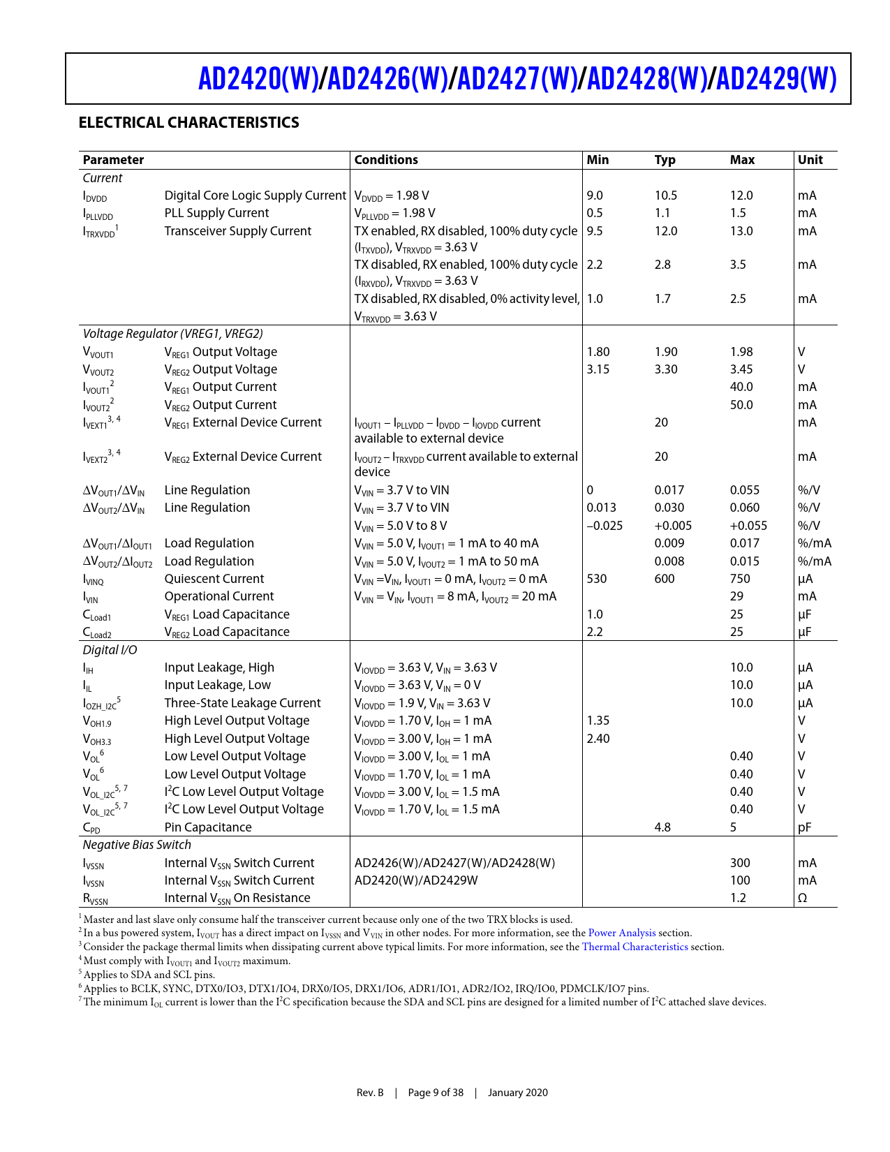 Current IDVDD Digital Core Logic Supply Current VDVDD = 1.98 V 9.0 10.5 12.0 mA IPLLVDD PLL Supply Current VPLLVDD = 1.98 V 0.5 1.1 1.5 mA I 1 TRXVDD Transceiver Supply Current TX enabled, RX disabled, 100% duty cycle 9.5 12.0 13.0 mA (ITXVDD), VTRXVDD = 3.63 V TX disabled, RX enabled, 100% duty cycle 2.2 2.8 3.5 mA (IRXVDD), VTRXVDD = 3.63 V TX disabled, RX disabled, 0% activity level, 1.0 1.7 2.5 mA VTRXVDD = 3.63 V Voltage Regulator (VREG1, VREG2) VVOUT1 VREG1 Output Voltage 1.80 1.90 1.98 V VVOUT2 VREG2 Output Voltage 3.15 3.30 3.45 V I 2 VOUT1 VREG1 Output Current 40.0 mA I 2 VOUT2 VREG2 Output Current 50.0 mA I 3, 4 VEXT1 VREG1 External Device Current IVOUT1 – IPLLVDD – IDVDD – IIOVDD current 20 mA available to external device I 3, 4 VEXT2 VREG2 External Device Current IVOUT2 – ITRXVDD current available to external 20 mA device VOUT1/VIN Line Regulation VVIN = 3.7 V to VIN 0 0.017 0.055 %/V VOUT2/VIN Line Regulation VVIN = 3.7 V to VIN 0.013 0.030 0.060 %/V VVIN = 5.0 V to 8 V –0.025 +0.005 +0.055 %/V VOUT1/IOUT1 Load Regulation VVIN = 5.0 V, IVOUT1 = 1 mA to 40 mA 0.009 0.017 %/mA VOUT2/IOUT2 Load Regulation VVIN = 5.0 V, IVOUT2 = 1 mA to 50 mA 0.008 0.015 %/mA IVINQ Quiescent Current VVIN =VIN, IVOUT1 = 0 mA, IVOUT2 = 0 mA 530 600 750 μA IVIN Operational Current VVIN = VIN, IVOUT1 = 8 mA, IVOUT2 = 20 mA 29 mA CLoad1 VREG1 Load Capacitance 1.0 25 μF CLoad2 VREG2 Load Capacitance 2.2 25 μF Digital I/O IIH Input Leakage, High VIOVDD = 3.63 V, VIN = 3.63 V 10.0 μA IIL Input Leakage, Low VIOVDD = 3.63 V, VIN = 0 V 10.0 μA I 5 OZH_I2C Three-State Leakage Current VIOVDD = 1.9 V, VIN = 3.63 V 10.0 μA VOH1.9 High Level Output Voltage VIOVDD = 1.70 V, IOH = 1 mA 1.35 V VOH3.3 High Level Output Voltage VIOVDD = 3.00 V, IOH = 1 mA 2.40 V V 6 OL Low Level Output Voltage VIOVDD = 3.00 V, IOL = 1 mA 0.40 V V 6 OL Low Level Output Voltage VIOVDD = 1.70 V, IOL = 1 mA 0.40 V V 5, OL_I2C 7 I2C Low Level Output Voltage VIOVDD = 3.00 V, IOL = 1.5 mA 0.40 V V 5, OL_I2C 7 I2C Low Level Output Voltage VIOVDD = 1.70 V, IOL = 1.5 mA 0.40 V CPD Pin Capacitance 4.8 5 pF Negative Bias Switch IVSSN Internal VSSN Switch Current AD2426(W)/AD2427(W)/AD2428(W) 300 mA IVSSN Internal VSSN Switch Current AD2420(W)/AD2429W 100 mA RVSSN Internal VSSN On Resistance 1.2 Ω 1 Master and last slave only consume half the transceiver current because only one of the two TRX blocks is used. 2 In a bus powered system, IVOUT has a direct impact on IVSSN and VVIN in other nodes. For more information, see the Power Analysis section. 3 Consider the package thermal limits when dissipating current above typical limits. For more information, see the Thermal Characteristics section. 4 Must comply with IVOUT1 and IVOUT2 maximum. 5 Applies to SDA and SCL pins. 6 Applies to BCLK, SYNC, DTX0/IO3, DTX1/IO4, DRX0/IO5, DRX1/IO6, ADR1/IO1, ADR2/IO2, IRQ/IO0, PDMCLK/IO7 pins. 7 The minimum IOL current is lower than the I2C specification because the SDA and SCL pins are designed for a limited number of I2C attached slave devices. Rev. B | Page 9 of 38 | January 2020 Document Outline Automotive Audio Bus A2B Transceiver A2B Bus Features A2B Transceiver Features Applications Table of Contents Revision History General Description A2B Bus Details I2C Interface I2S/TDM Interface I2S Reduced Rate Pulse Density Modulation (PDM) Interface GPIO Over Distance Mailboxes Data Slot Exchange Between Slaves Clock Sustain State Programmable Settings to Optimize EMC Performance Programmable LVDS Transmit Levels Spread-Spectrum Clocking Unique ID Support for Crossover or Straight Through Cabling Data Only and Power Only Bus Operation Specifications Operating Conditions Electrical Characteristics Power Supply Rejection Ratio (PSRR) Timing Specifications Power-Up Sequencing Restrictions A2B Bus System Specification RMS Time Interval Error (TIE) Jitter PDM Typical Performance Characteristics Absolute Maximum Ratings Thermal Characteristics ESD Caution Test Circuits and Switching Characteristics Output Drive Currents Test Conditions Output Enable Time Measurement Output Disable Time Measurement Capacitive Loading Pin Configuration and Function Descriptions Power Analysis Current Flow Constant Current PLL Supply Current VIN Quiescent Current IOVDD Current Peripheral Supply Current Digital Logic Supply Current A2B Bus TX/RX Current LVDS Transmitter and Receiver Supply Currents Downstream/Upstream Activity Level LVDS Transmitter and Receiver Idle Current VREG1 and VREG2 Output Currents Current at VIN (IVIN) Power Dissipation Resistance Between Nodes Voltage Regulator Current in Master Node or Local Powered Slave Node Power Dissipation of A2B Bus Power Analysis of Bus Powered System Supply Voltage Reducing Power Consumption Power-Down Mode Standby Mode Control Mode Thermal Power Designer Reference VSENSE and Considerations for Diodes Optional Add On Circuits Layout Guidelines Outline Dimensions Automotive Products Ordering Guide