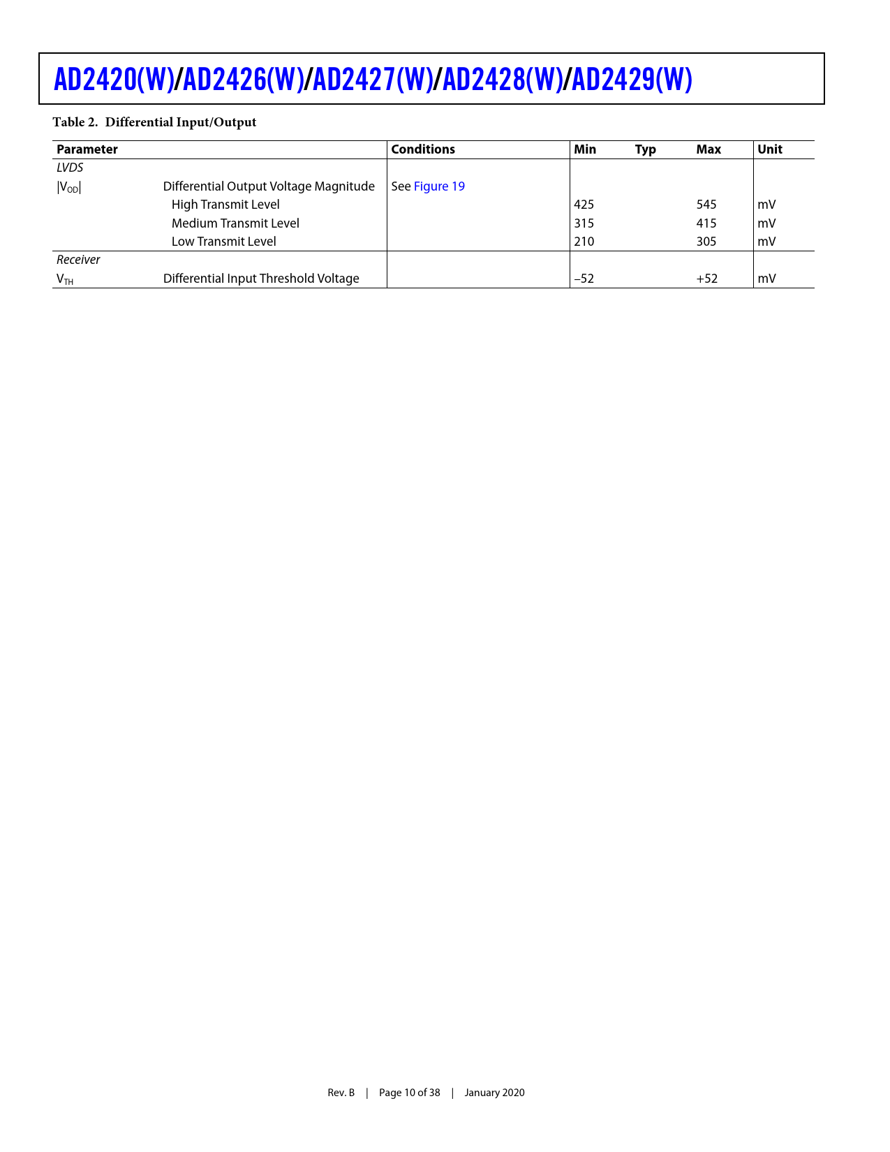 AD2420(W). /AD2426(W). /AD2427(W). /AD2428(W). AD2429(W). Table 2. Differential Input/Output. Parameter. Conditions. Min. Typ. Max. Unit