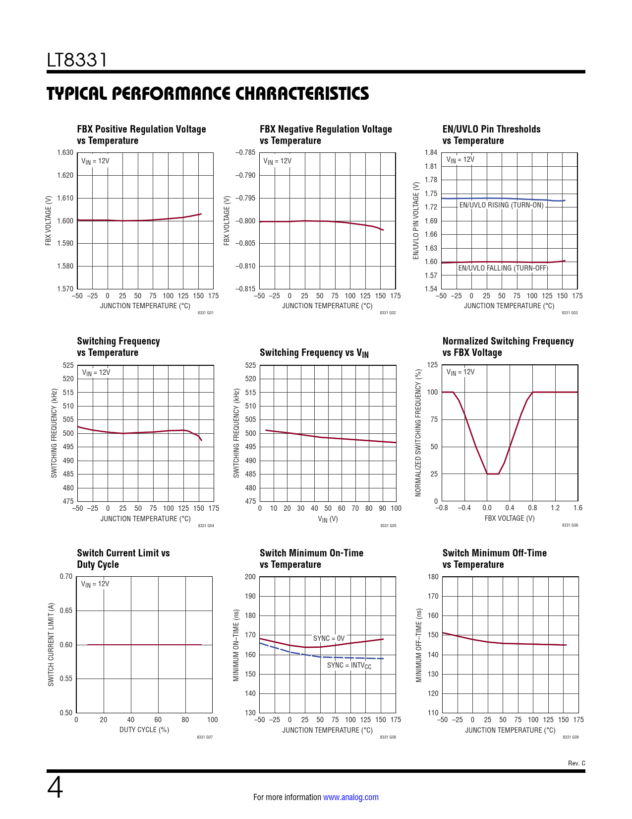 0.70 200 180 VIN = 12V 190 170 0.65 180 160 170 SYNC = 0V 150 0.60 160 140 SYNC = INTVCC 150 130 0.55 MINIMUM ON–TIME (ns) SWITCH CURRENT LIMIT (A) MINIMUM OFF–TIME (ns) 140 120 0.50 130 110 0 20 40 60 80 100 –50 –25 0 25 50 75 100 125 150 175 –50 –25 0 25 50 75 100 125 150 175 DUTY CYCLE (%) JUNCTION TEMPERATURE (°C) JUNCTION TEMPERATURE (°C) 8331 G07 8331 G08 8331 G09 Rev. C 4 For more information www.analog.com Document Outline Features Applications Typical Application Description Absolute Maximum Ratings Order Information Electrical Characteristics Pin Configuration Electrical Characteristics Typical Performance Characteristics Pin Functions Block Diagram Operation Applications Information Typical Applications Package Description Revision History Typical Application Related Parts