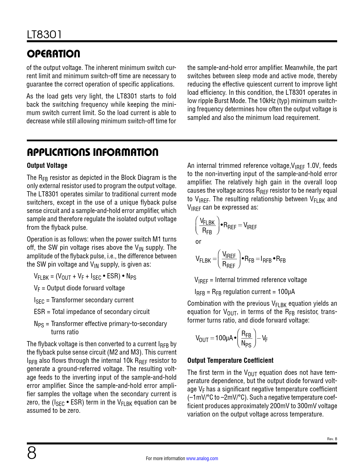 LT8301 OPERATION of the output voltage. The inherent minimum switch cur- the sample-and-hold error amplifier. Meanwhile, the part rent limit and minimum switch-off time are necessary to switches between sleep mode and active mode, thereby guarantee the correct operation of specific applications. reducing the effective quiescent current to improve light As the load gets very light, the LT8301 starts to fold load efficiency. In this condition, the LT8301 operates in back the switching frequency while keeping the mini- low ripple Burst Mode. The 10kHz (typ) minimum switch- mum switch current limit. So the load current is able to ing frequency determines how often the output voltage is decrease while still allowing minimum switch-off time for sampled and also the minimum load requirement. APPLICATIONS INFORMATION Output Voltage An internal trimmed reference voltage,VIREF 1.0V, feeds The R to the non-inverting input of the sample-and-hold error FB resistor as depicted in the Block Diagram is the only external resistor used to program the output voltage. amplifier. The relatively high gain in the overall loop The LT8301 operates similar to traditional current mode causes the voltage across RREF resistor to be nearly equal switchers, except in the use of a unique flyback pulse to VIREF. The resulting relationship between VFLBK and sense circuit and a sample-and-hold error amplifier, which VIREF can be expressed as: sample and therefore regulate the isolated output voltage ⎛ VFLBK ⎞ from the flyback pulse. ⎝⎜ RFB ⎠⎟ •RREF = VIREF Operation is as follows: when the power switch M1 turns or off, the SW pin voltage rises above the VIN supply. The amplitude of the flyback pulse, i.e., the difference between ⎛ V ⎞ V IREF the SW pin voltage and V FLBK = IN supply, is given as: ⎝⎜ RREF ⎠⎟ •RFB =IRFB •RFB VFLBK = (VOUT + VF + ISEC • ESR) • NPS VIREF = Internal trimmed reference voltage VF = Output diode forward voltage IRFB = RFB regulation current = 100µA ISEC = Transformer secondary current Combination with the previous VFLBK equation yields an ESR = Total impedance of secondary circuit equation for VOUT, in terms of the RFB resistor, trans- N former turns ratio, and diode forward voltage: PS = Transformer effective primary-to-secondary turns ratio ⎛ R ⎞ V FB The flyback voltage is then converted to a current I OUT = 100µA • RFB by ⎝⎜ NPS ⎠⎟ − VF the flyback pulse sense circuit (M2 and M3). This current IRFB also flows through the internal 10k RREF resistor to Output Temperature Coefficient generate a ground-referred voltage. The resulting volt- The first term in the V age feeds to the inverting input of the sample-and-hold OUT equation does not have tem- perature dependence, but the output diode forward volt- error amplifier. Since the sample-and-hold error ampli- age V fier samples the voltage when the secondary current is F has a significant negative temperature coefficient (–1mV/°C to –2mV/°C). Such a negative temperature coef- zero, the (ISEC • ESR) term in the VFLBK equation can be ficient produces approximately 200mV to 300mV voltage assumed to be zero. variation on the output voltage across temperature. Rev. B 8 For more information www.analog.com Document Outline Features Applications Typical Application Description Absolute Maximum Ratings Order Information Pin Configuration Electrical Characteristics Typical Performance Characteristics Pin Functions Block Diagram Operation Applications Information Typical Applications Package Description Revision History Typical Application Related Parts