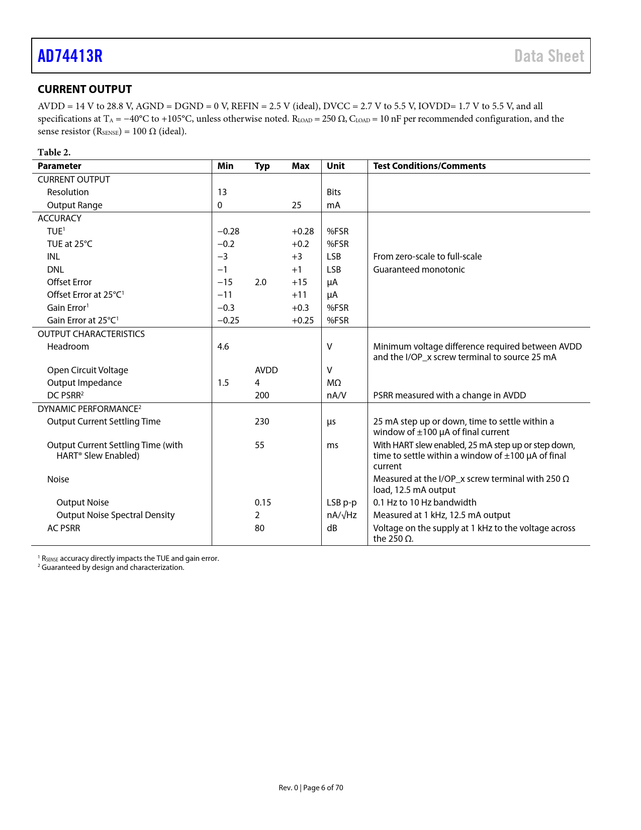 AD74413R. Data Sheet. CURRENT OUTPUT. Table 2. Parameter Min. Typ. Max. Unit. Test. Conditions/Comments