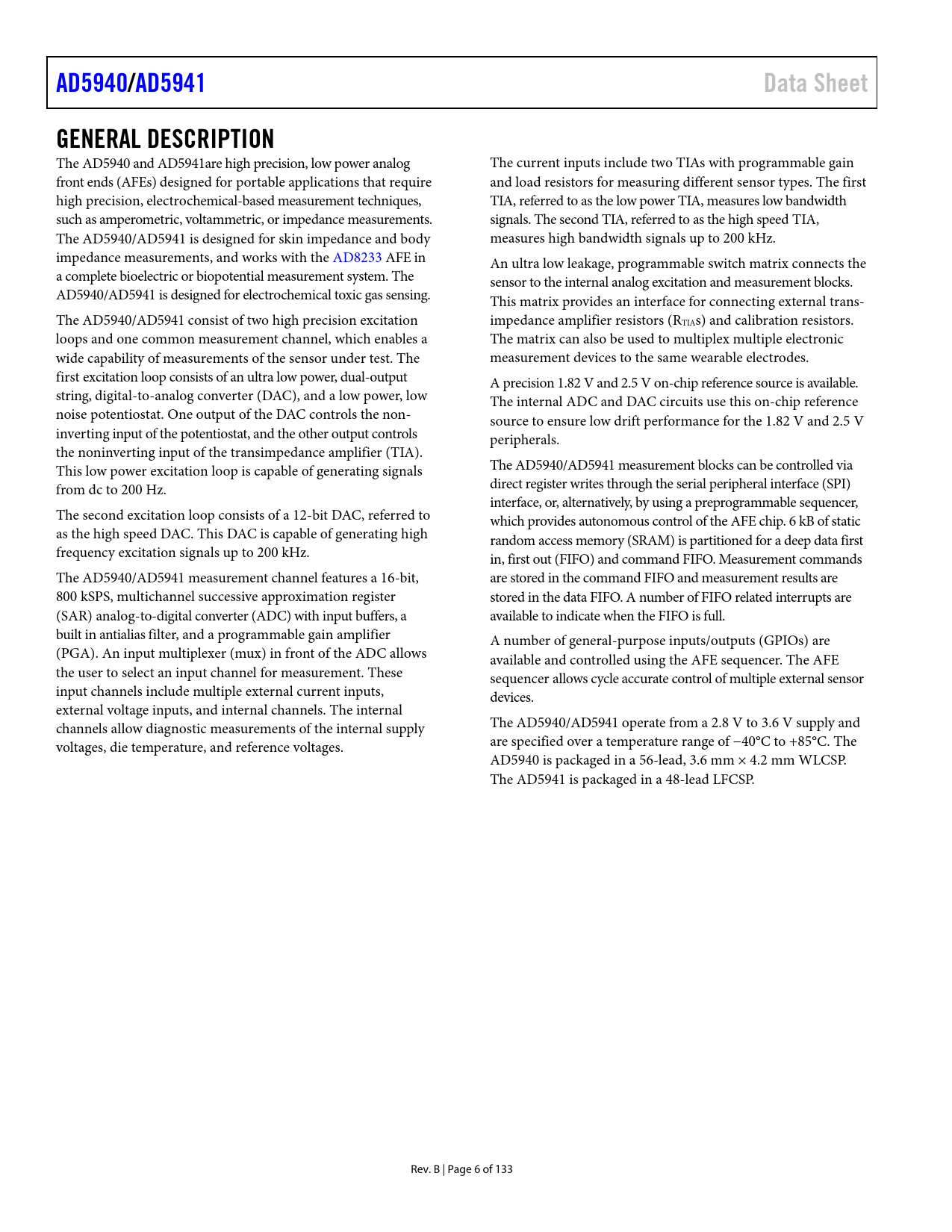 AD5940/AD5941Data SheetGENERAL DESCRIPTION The AD5940 and AD5941are high precision, low power analog The current inputs include two TIAs with programmable gain front ends (AFEs) designed for portable applications that require and load resistors for measuring different sensor types. The first high precision, electrochemical-based measurement techniques, TIA, referred to as the low power TIA, measures low bandwidth such as amperometric, voltammetric, or impedance measurements. signals. The second TIA, referred to as the high speed TIA, The AD5940/AD5941 is designed for skin impedance and body measures high bandwidth signals up to 200 kHz. impedance measurements, and works with the AD8233 AFE in An ultra low leakage, programmable switch matrix connects the a complete bioelectric or biopotential measurement system. The sensor to the internal analog excitation and measurement blocks. AD5940/AD5941 is designed for electrochemical toxic gas sensing. This matrix provides an interface for connecting external trans- The AD5940/AD5941 consist of two high precision excitation impedance amplifier resistors (RTIAs) and calibration resistors. loops and one common measurement channel, which enables a The matrix can also be used to multiplex multiple electronic wide capability of measurements of the sensor under test. The measurement devices to the same wearable electrodes. first excitation loop consists of an ultra low power, dual-output A precision 1.82 V and 2.5 V on-chip reference source is available. string, digital-to-analog converter (DAC), and a low power, low The internal ADC and DAC circuits use this on-chip reference noise potentiostat. One output of the DAC controls the non- source to ensure low drift performance for the 1.82 V and 2.5 V inverting input of the potentiostat, and the other output controls peripherals. the noninverting input of the transimpedance amplifier (TIA). This low power excitation loop is capable of generating signals The AD5940/AD5941 measurement blocks can be controlled via from dc to 200 Hz. direct register writes through the serial peripheral interface (SPI) interface, or, alternatively, by using a preprogrammable sequencer, The second excitation loop consists of a 12-bit DAC, referred to which provides autonomous control of the AFE chip. 6 kB of static as the high speed DAC. This DAC is capable of generating high random access memory (SRAM) is partitioned for a deep data first frequency excitation signals up to 200 kHz. in, first out (FIFO) and command FIFO. Measurement commands The AD5940/AD5941 measurement channel features a 16-bit, are stored in the command FIFO and measurement results are 800 kSPS, multichannel successive approximation register stored in the data FIFO. A number of FIFO related interrupts are (SAR) analog-to-digital converter (ADC) with input buffers, a available to indicate when the FIFO is ful . built in antialias filter, and a programmable gain amplifier A number of general-purpose inputs/outputs (GPIOs) are (PGA). An input multiplexer (mux) in front of the ADC allows available and controlled using the AFE sequencer. The AFE the user to select an input channel for measurement. These sequencer allows cycle accurate control of multiple external sensor input channels include multiple external current inputs, devices. external voltage inputs, and internal channels. The internal channels allow diagnostic measurements of the internal supply The AD5940/AD5941 operate from a 2.8 V to 3.6 V supply and voltages, die temperature, and reference voltages. are specified over a temperature range of −40°C to +85°C. The AD5940 is packaged in a 56-lead, 3.6 mm × 4.2 mm WLCSP. The AD5941 is packaged in a 48-lead LFCSP. Rev. B | Page 6 of 133 Document Outline FEATURES APPLICATIONS SIMPLIFIED BLOCK DIAGRAM TABLE OF CONTENTS REVISION HISTORY FUNCTIONAL BLOCK DIAGRAM GENERAL DESCRIPTION SPECIFICATIONS ADC RMS NOISE SPECIFICATIONS ADC RMS Noise: Digital Filter Settings ADC RMS Noise: Peak-to-Peak Effective Bits SPI TIMING SPECIFICATIONS SPI Timing Diagram ABSOLUTE MAXIMUM RATINGS THERMAL RESISTANCE ESD CAUTION PIN CONFIGURATION AND FUNCTION DESCRIPTIONS TYPICAL PERFORMANCE CHARACTERISTICS REFERENCE TEST CIRCUIT THEORY OF OPERATION CONFIGURATION REGISTERS Configuration Register—AFECON Power Mode Configuration Register—PMBW SILICON IDENTIFICATION IDENTIFICATION REGISTERS Analog Devices, Inc., Identification Register—ADIID Chip Identification Register—CHIPID SYSTEM INITIALIZATION LOW POWER DAC LOW POWER DAC SWITCH OPTIONS RELATIONSHIP BETWEEN THE 12-BIT AND 6-BIT OUTPUTS LOW POWER DAC USE CASES Electrochemical Amperometric Measurement Electrochemical Impedance Spectroscopy Low Power DAC in 4-Wire Isolated Impedance Measurements LOW POWER DAC CIRCUIT REGISTERS LPDACCON0 Register—LPDACCON0 Low Power DAC Switch Control Register—LPDACSW0 Low Power DAC Data Output Register—LPDACDAT0 Low Power Reference Control Register—LPREFBUFCON Common-Mode Switch Mux Register—SWMUX LOW POWER POTENTIOSTAT LOW POWER TIA LOW POWER TIA PROTECTION DIODES Current-Limit Feature of the Low Power TIA and Potentiostat amplifier Low Power TIA Force/Sense Feature USING AN EXTERNAL RTIA RECOMMENDED SWITCH SETTINGS FOR VARIOUS OPERATING MODES LOW POWER TIA CIRCUITS REGISTERS Low Power TIA Switch Configuration Register—LPTIASW0 Low Power TIA Control Bits, Channel 0 Register—LPTIACON0 HIGH SPEED DAC CIRCUITS HIGH SPEED DAC OUTPUT SIGNAL GENERATION POWER MODES OF THE HIGH SPEED DAC CORE Low Power Mode High Power Mode Hibernate Mode HIGH SPEED DAC FILTER OPTIONS HIGH SPEED DAC OUTPUT ATTENUATION OPTIONS HIGH SPEED DAC EXCITATION AMPLIFIER COUPLING AN AC SIGNAL FROM THE HIGH SPEED DAC TO THE DC LEVEL SET BY THE LOW POWER DAC AVOIDING INCOHERENCY ERRORS BETWEEN EXCITATION AND MEASUREMENT FREQUENCIES DURING IMPEDANCE MEASUREMENTS HIGH SPEED DAC CALIBRATION OPTIONS HIGH SPEED DAC CIRCUIT REGISTERS High Speed DAC Configuration Register—HSDACCON High Speed DAC Code Register—HSDACDA